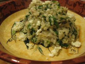 Melt the butter in a large skillet over medium heat. When it is nearly all melted, add the garlic and sauté for just a minute or two, until the aroma is enticing. Add the leeks and sauté until they are softened. Leeks are a new love of mine. They are the least aggressively flavored members of the onion family, and I think they taste like a cross between a sweet onion and garlic. They don’t have that astringency onions sometimes do, and I think they are like a stalk of springtime. I’ve started putting them in frittatas, and when I had one left over on the night I made this little concoction, it seemed like the perfect thing to add in.
