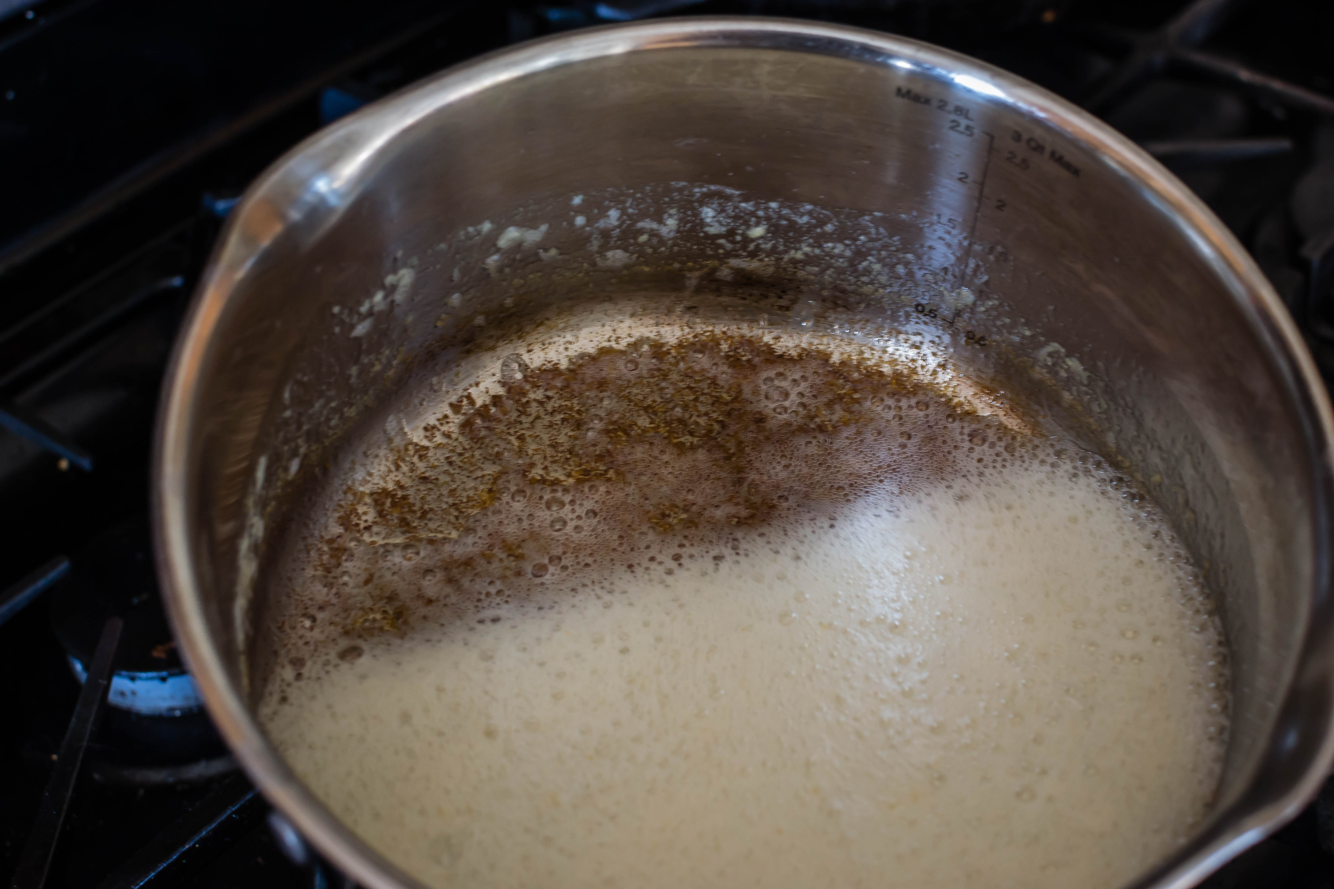 • Meanwhile, brown the butter and prepare the remaining apples. For the butter, melt all 3 sticks in a medium saucepan and let cook over medium heat until the solids on the bottom take on a toasty brown color. First it will foam up, then subside, then brown. It’s easiest to use a pot that does not have a dark surface, since you can see color changes in the butter more easily. Once those bits have browned, remove the pot from the heat and let cool.