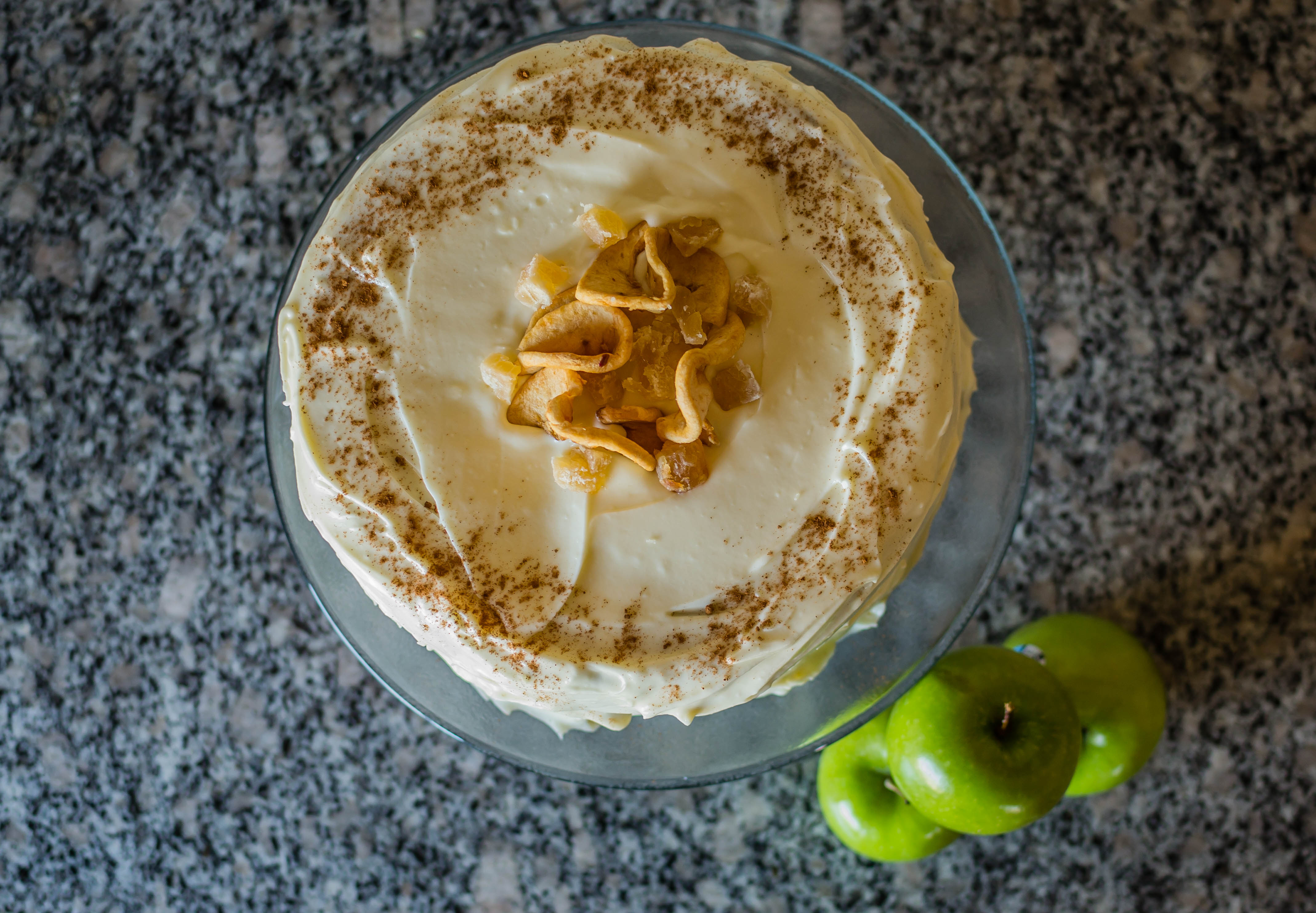 • This looks lovely with just the frosting, but if you want to decorate a little, consider artfully arranging a few dried apple rings and chunks of crystalized ginger in the center of the cake, then dusting the top edge with cinnamon before slicing and serving.