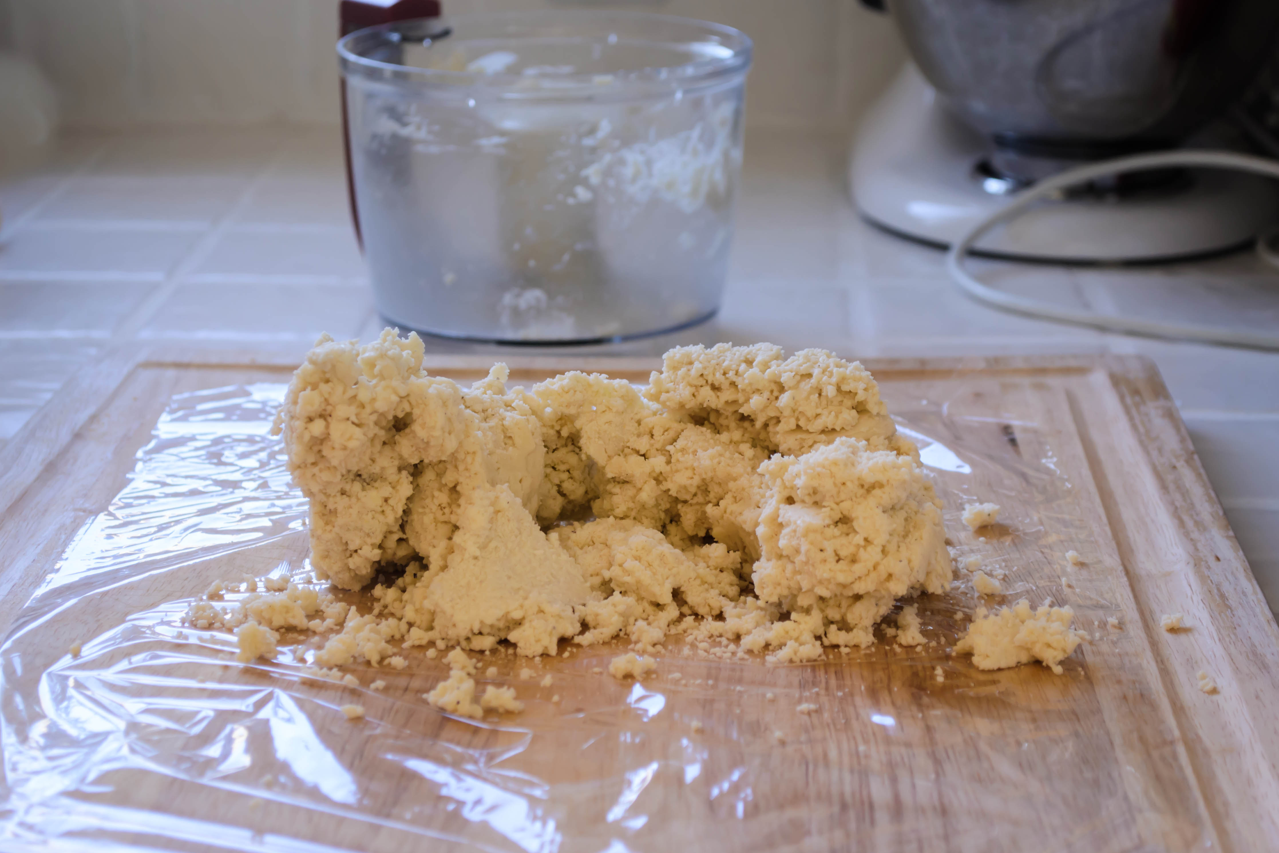 - Dump out your crumbles of just-tacky dough onto a big piece of plastic wrap. Using the plastic wrap to help you, press and squash and manipulate the dough into a disc of about 1 inch thick. Wrap it up and stow it in the fridge for 30-45 minutes.