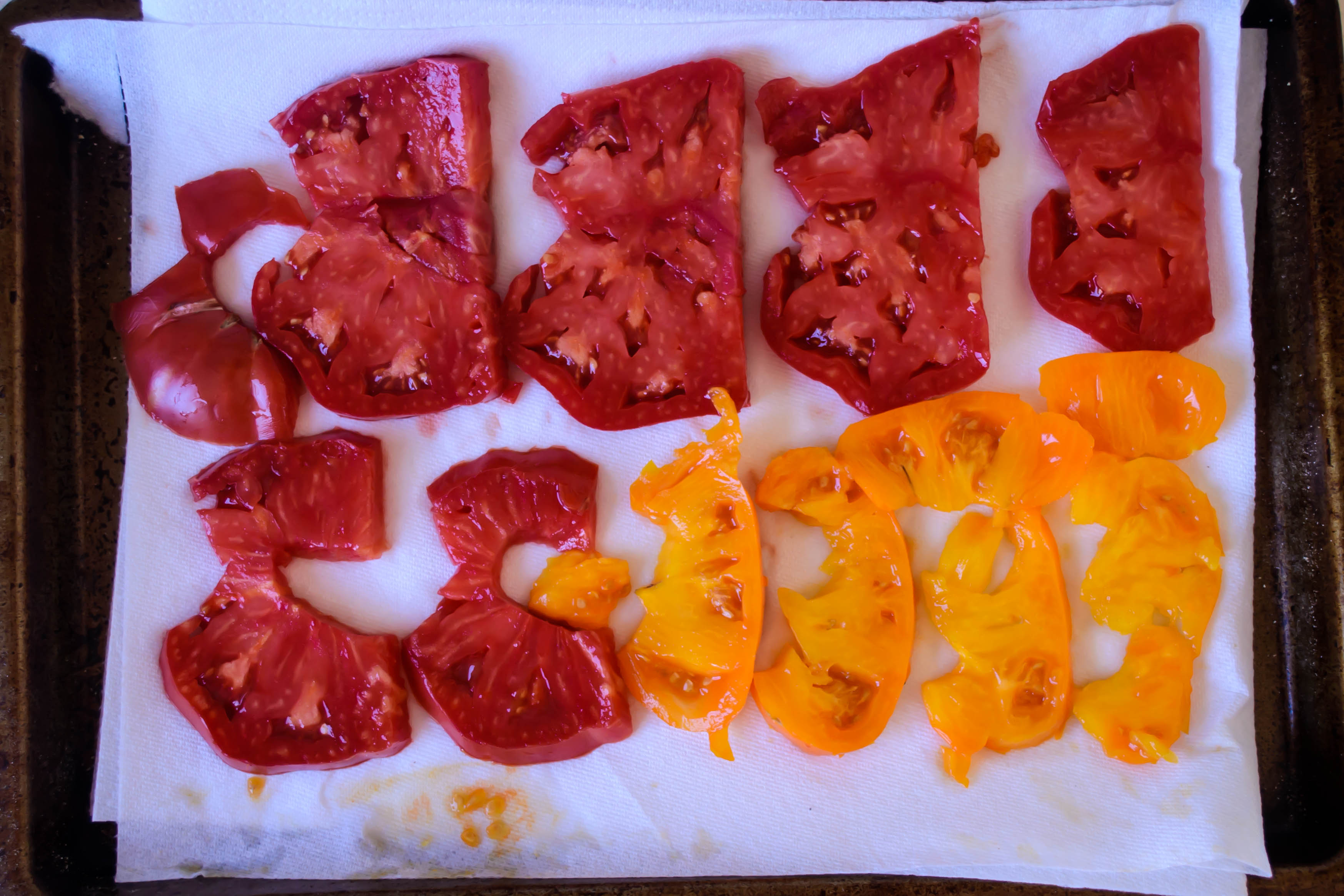 - Place the sliced tomatoes on a double layer of paper towels lining a cookie sheet. This will allow them to drain a bit, so they won’t expel quite as much juice in the oven. Let them sit for at least 15 minutes.