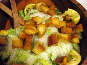 Since sharing lunch with my friend S. a few weeks ago, I have developed a minor obsession with Caesar Salad. The crispest romaine, whether to add the Parmesan by shreds, crumbles, grates or curls, the perfectly textured crouton: crisp and golden on the outside, with the barest hint of residual chewiness deep within. But mostly, the object of mystery and allure is the dressing. It’s tangy but creamy and rich but still light, and pulls the flavors of the salad together to make it a phenomenon. I decided to make it. In the gloom of winter, I don’t have the opportunities I’d like to find farm-fresh eggs, and locally grown egg yolk is all I would feel comfortable using without cooking it. Besides, N. gets worried about raw foods sometimes, and he doesn’t care for the idea of fish in dressing, so egg and anchovy were out. I poked around online and found some vegan Caesar salad dressings with interesting suggestions, including the addition of brewer’s yeast and tamari to add the salty richness of anchovy. I collected ideas and then, as usually happens, ended up making my own.