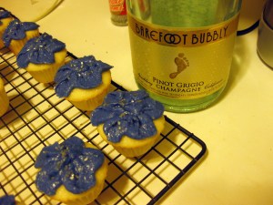 Survey said these were the best version I’d attempted yet by leaps and bounds. The filling was perfect because it provided the right counterpoint to the achingly sweet frosting and the delicately sugary cake. The flowers looked like flowers, and the blue sugar I found for the full size cupcakes is a deep enough blue to look sophisticated and adult (previous, lighter versions would bit better on sweets for a baby shower than on wedding cupcakes).
