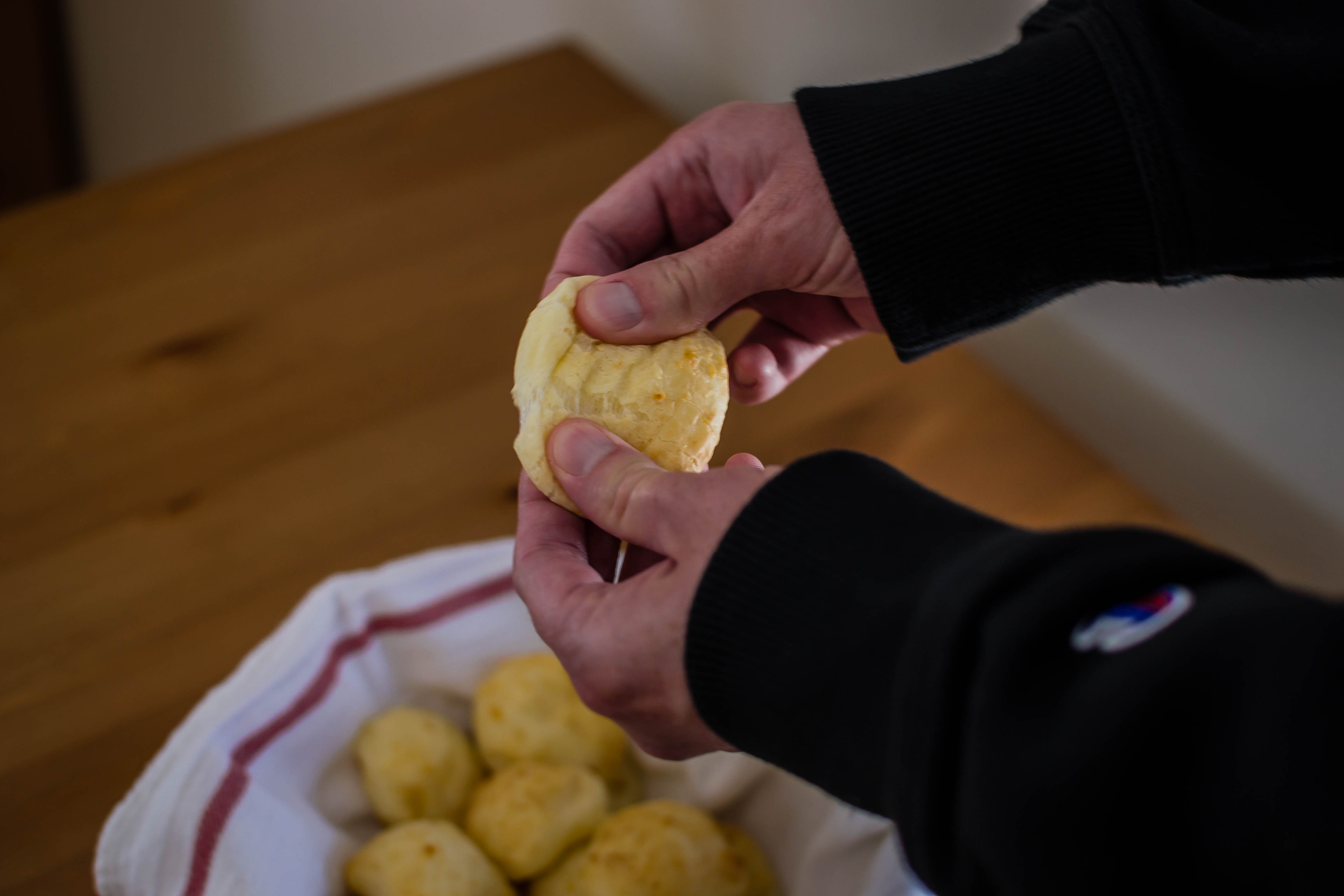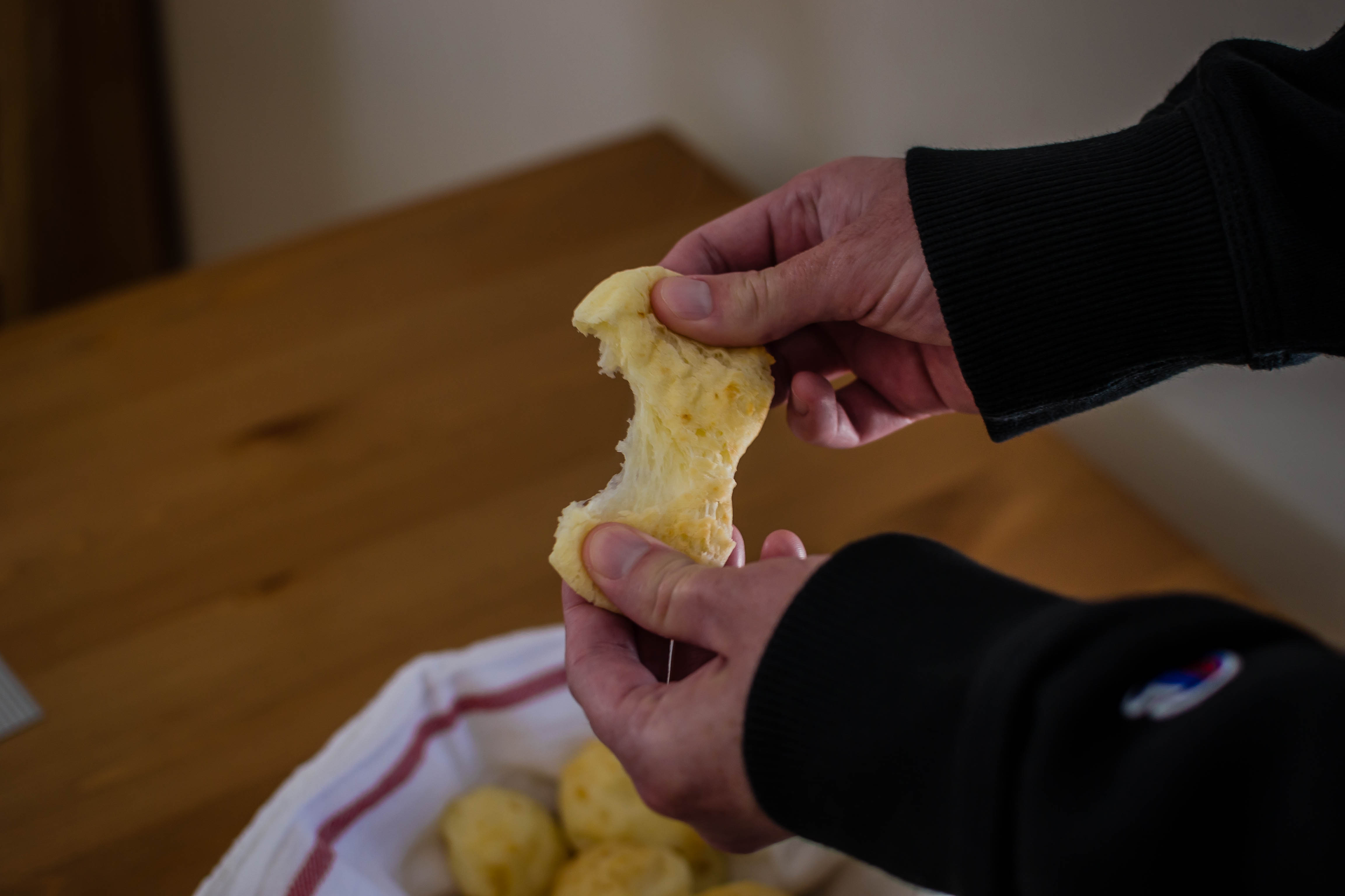 - Once the dough has doubled in size, turn it out onto a lightly floured board and remove a piece the size of a small fist. Cut this into four pieces, then roll each into a thin strand about 6 inches in length. Cut each thin strand in half: these are for your Xs to hold in the egg “eyes.”