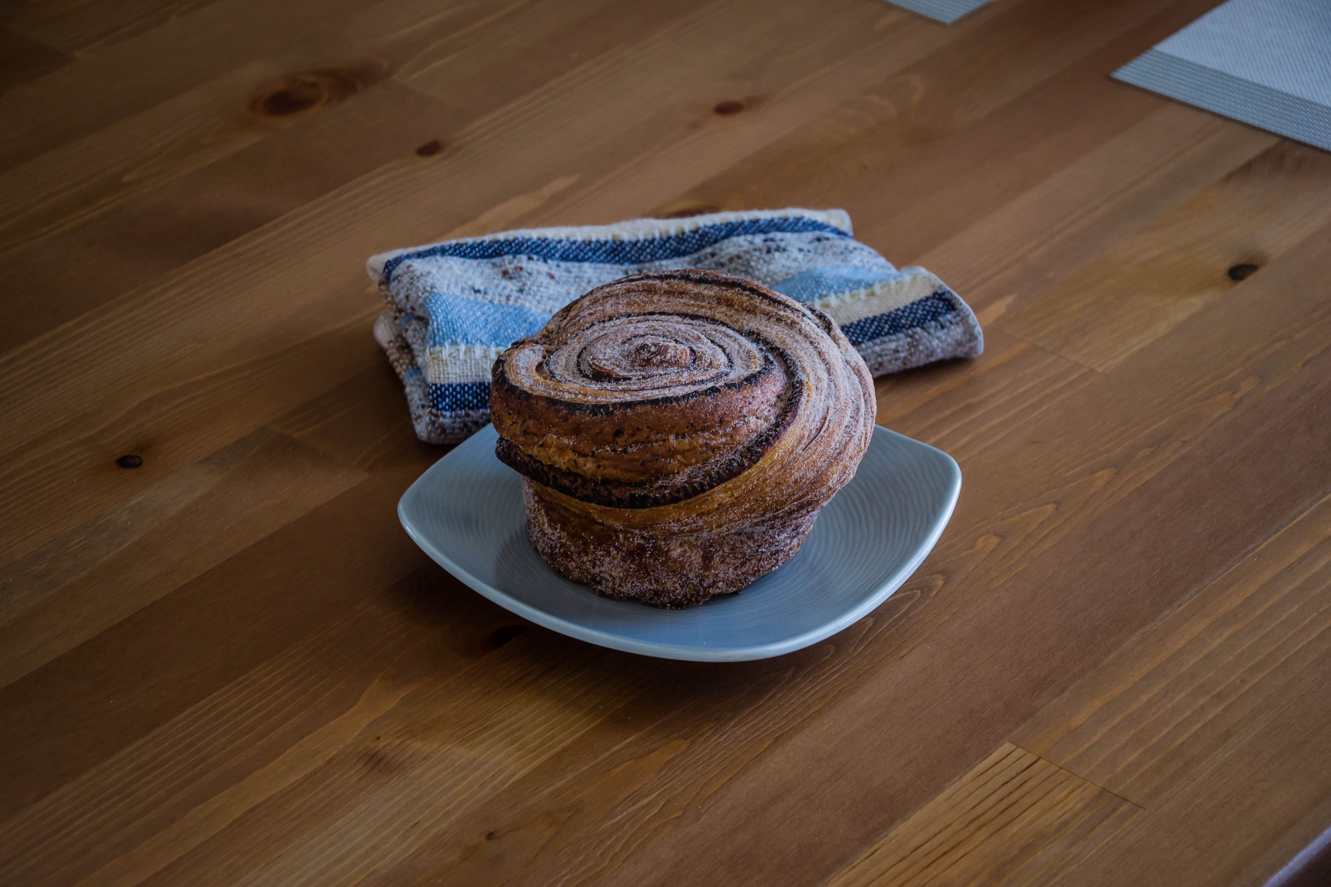 The best part about this bread, besides eating it, is the shaping. It’s a lovely dough to work with, as are most enriched doughs, elastic and puffy. After lightly flattening and scoring the main ball, you get to poke in two divots, insert a hard boiled egg* into each, and add two pieces of dough in an X shape across the eggs and pressed into the main loaf, where they hold the eggs in place during baking. If you’re going the fancy route, you can use additional pieces of dough to make Haman’s facial features or, if you’re keeping it comparatively simple, as I did, you can just snip around the edge of each loaf at one inch intervals with scissors, which makes a lovely pattern like sunflower petals or, I suppose, like thick locks of Haman’s beard and hair.
