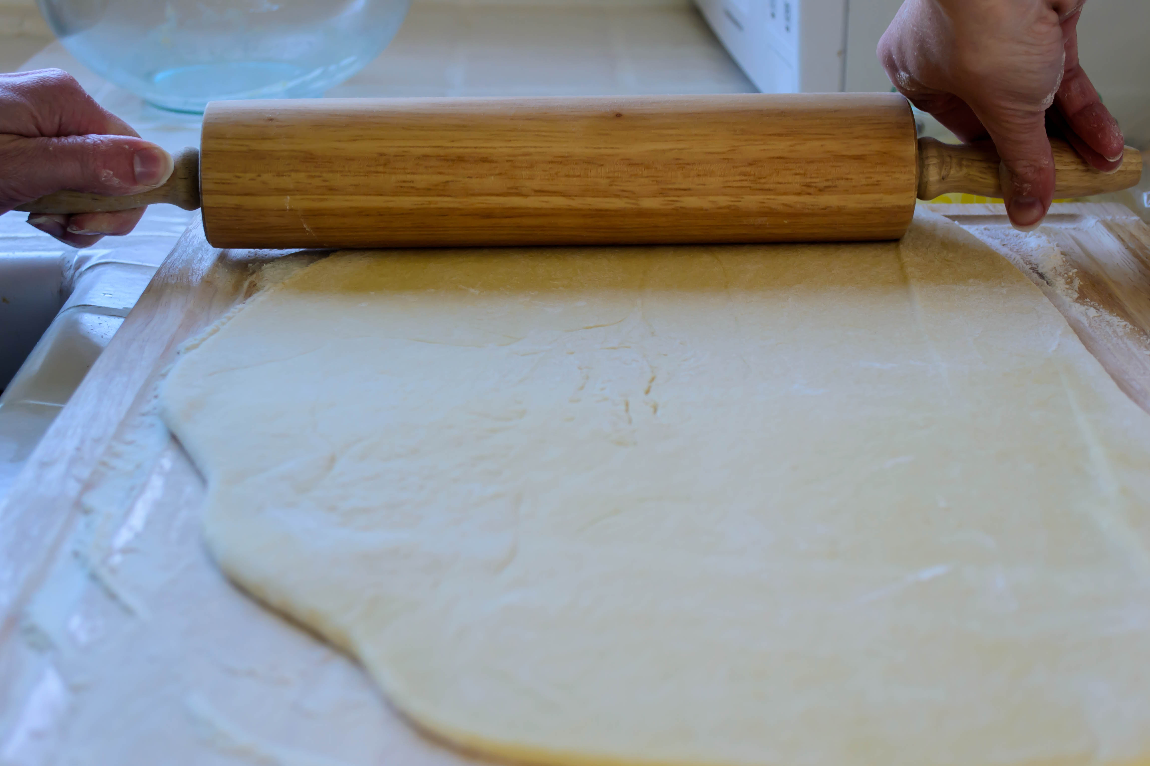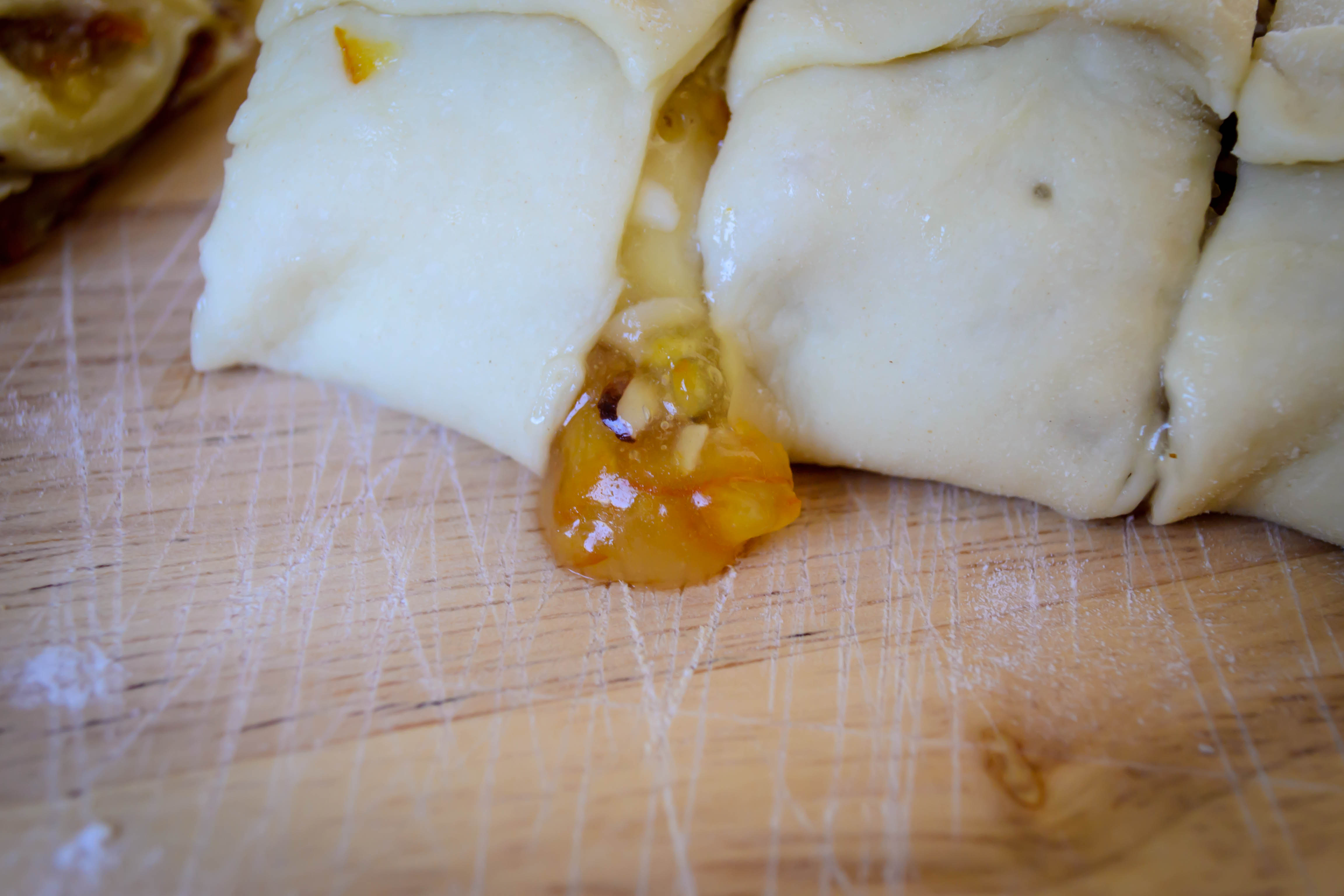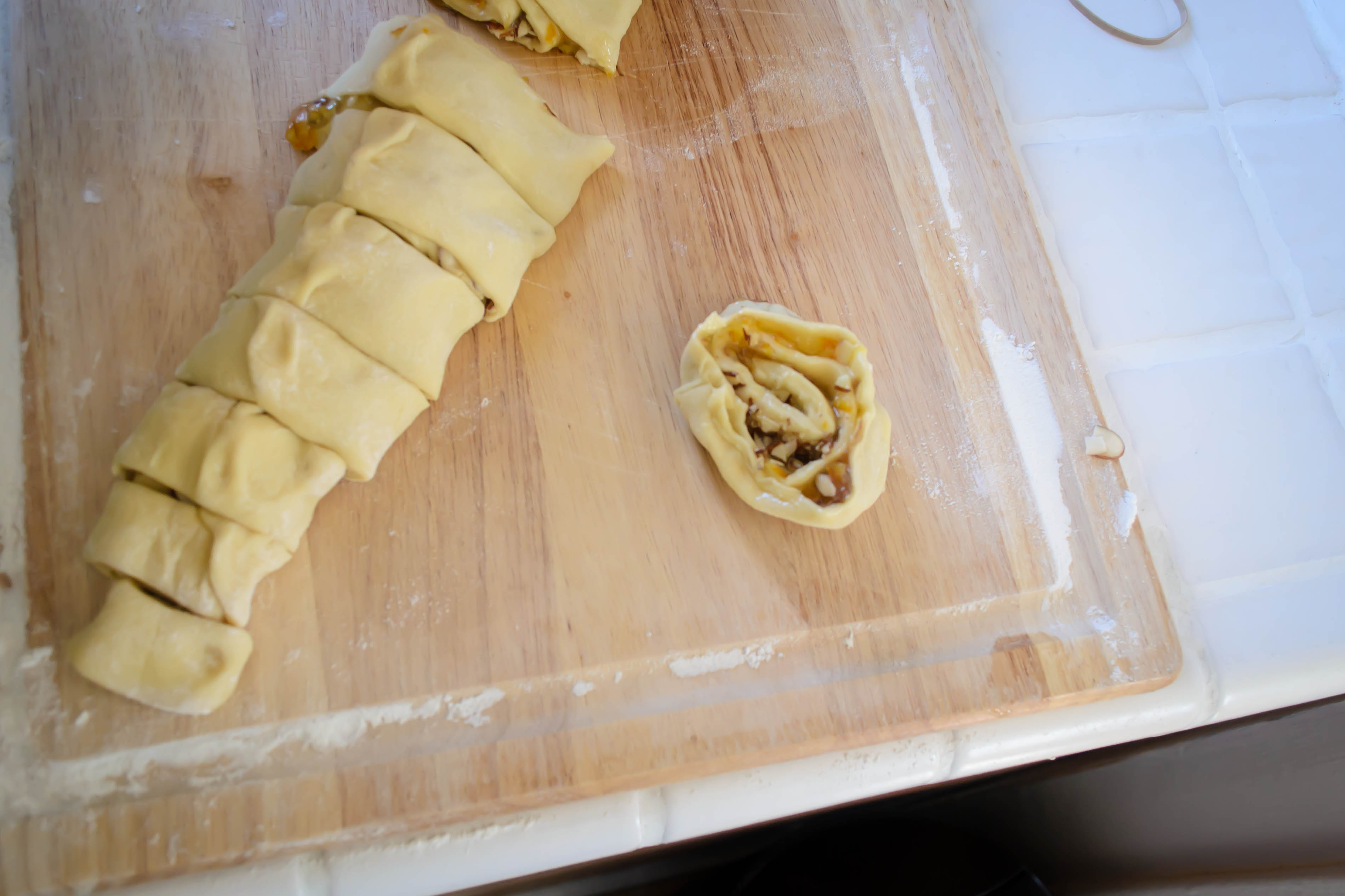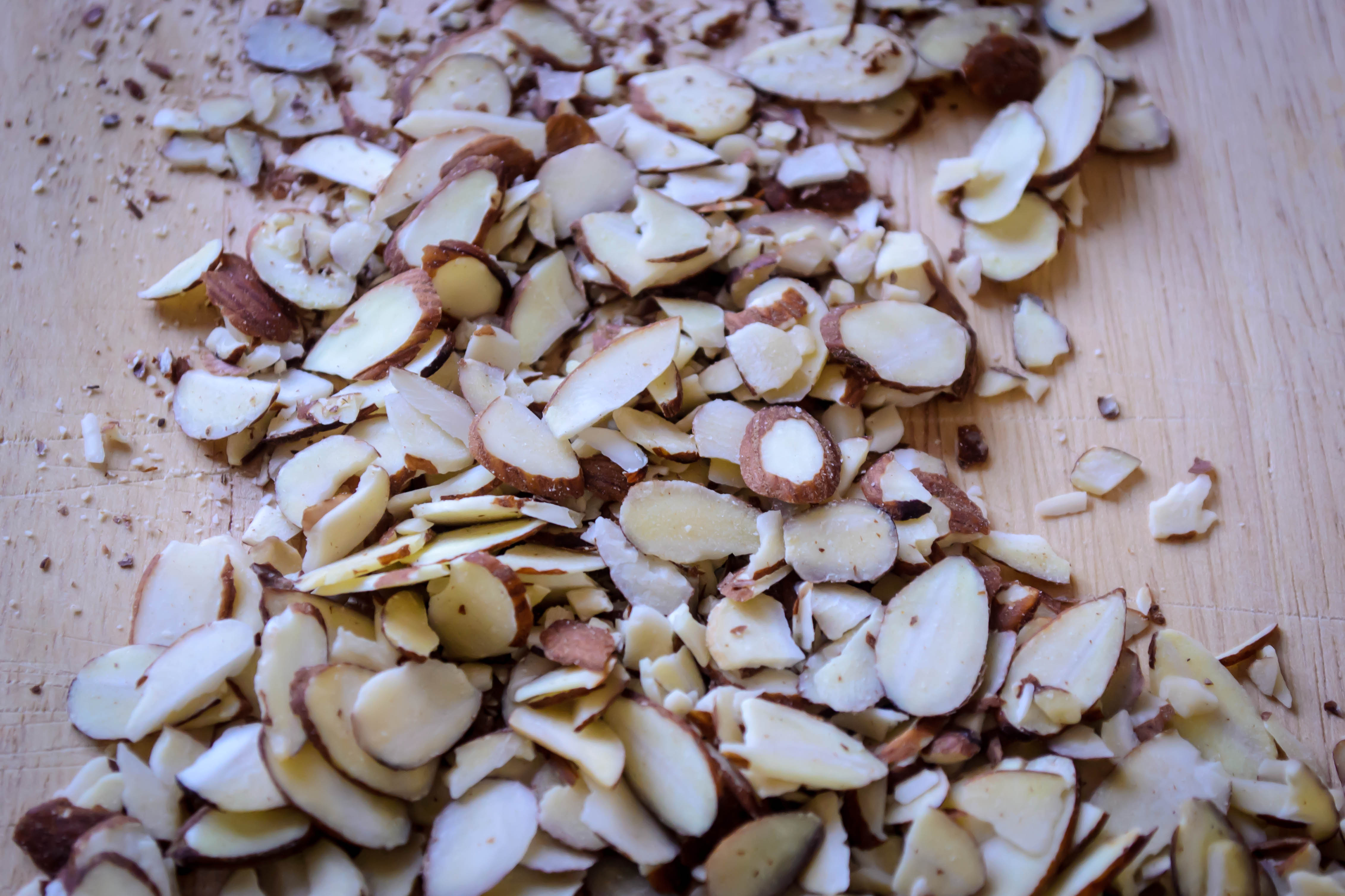 - First, make the filling. Preheat the oven to 350F. While it heats, roughly chop the almonds – it’s okay to have some uneven sizing. Spread them out on a baking tray and toast in the oven 10-15 minutes until they are golden brown. Start checking at 10 minutes; keep in mind they will continue to cook after you take them out of the oven.