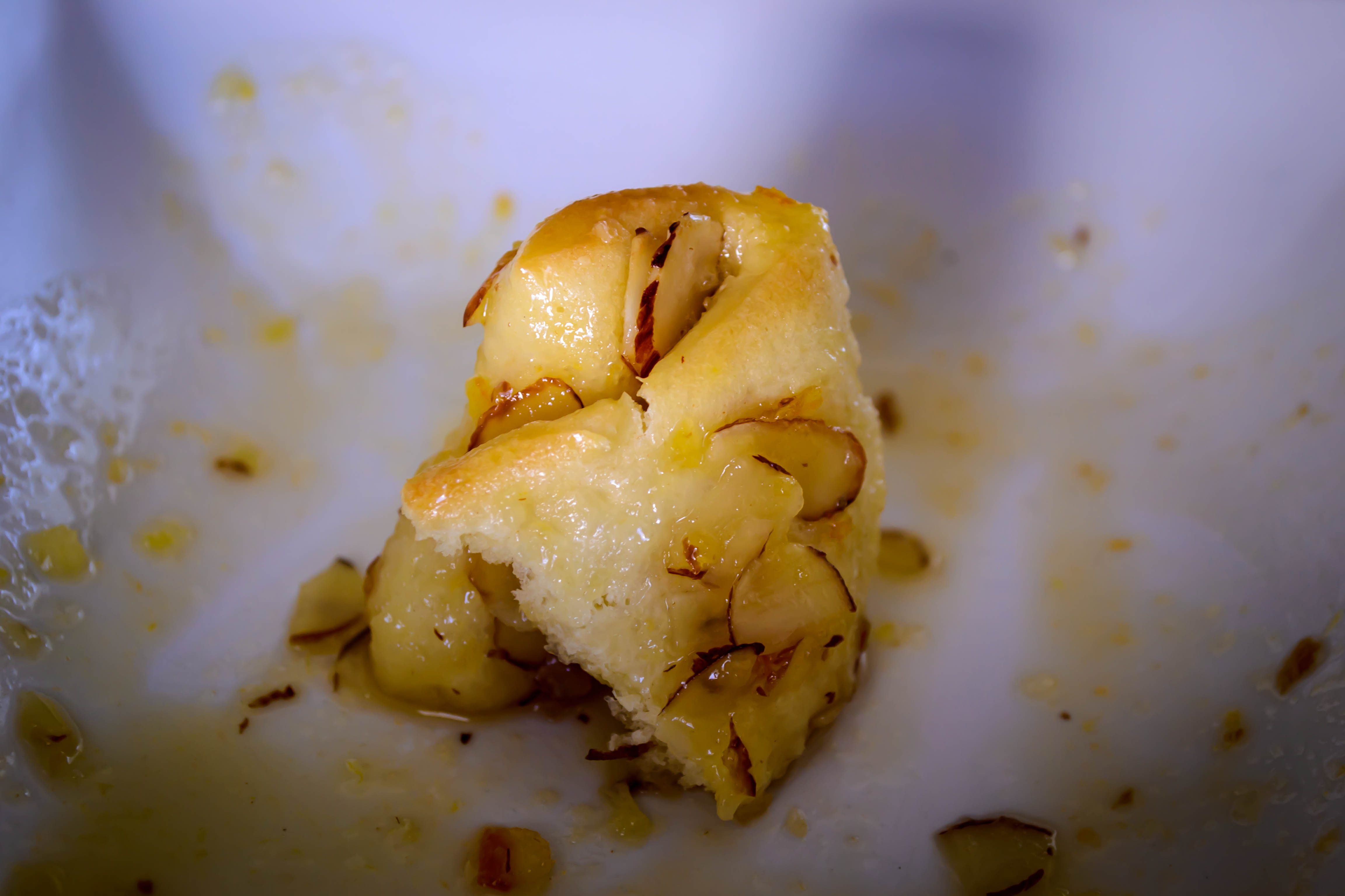 - In a bowl, whisk the mascarpone cheese and the heavy cream together until light and fluffy (I used the whisk attachment of my stand mixer). Add the honey, the lemon zest, and the lemon juice, whisk again and taste for seasoning – you are looking for something lightly sweet, and rich but not overwhelming. When the almonds cool, fold ¾ of the amount into the mascarpone mixture, reserving the remainder to sprinkle atop the crepes.