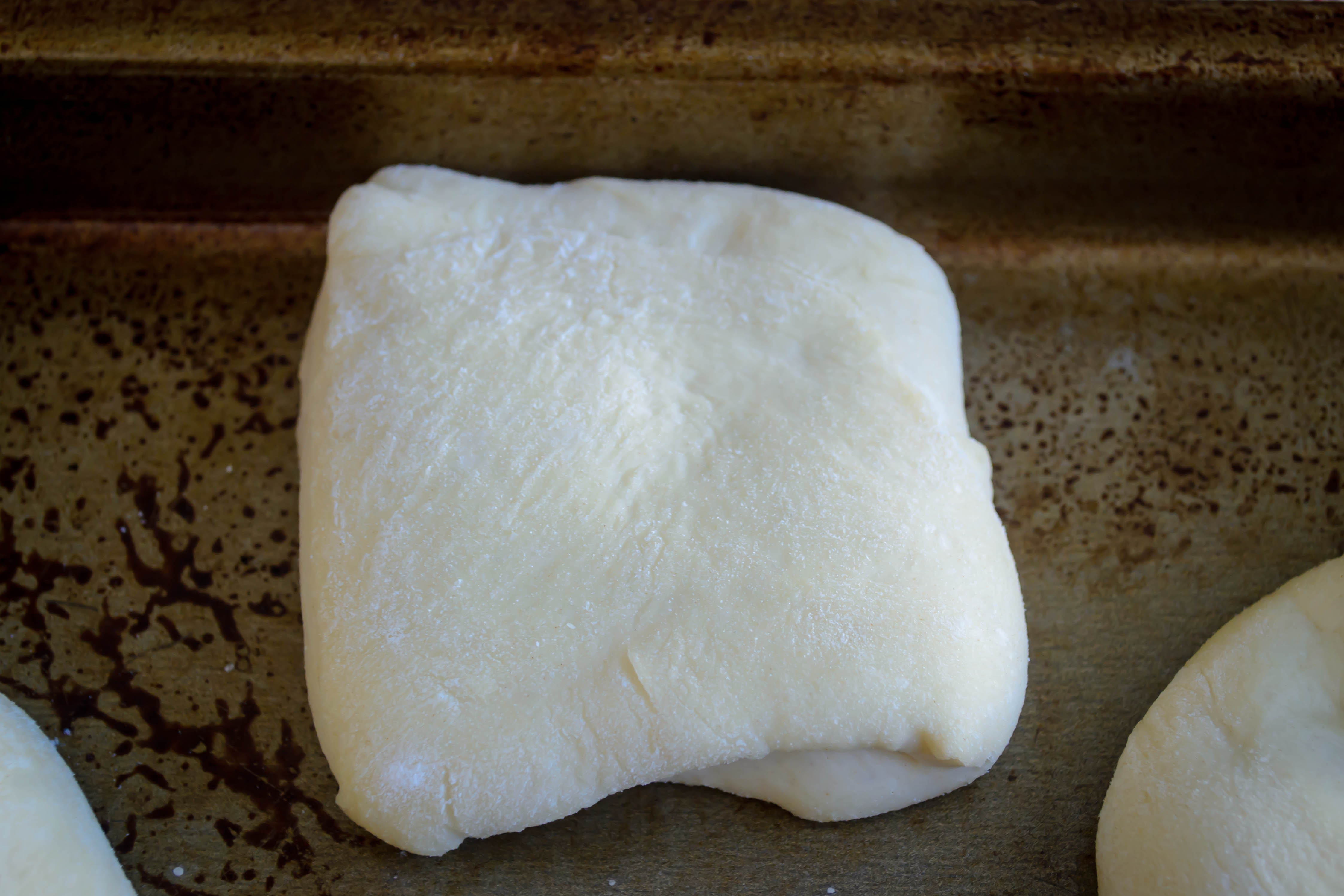 You’ve now folded your dough a total of four times, which means you’ve made twelve layers. Now, roll it out to ½ inch thick and cut it into 6 pieces. You could do rounds with a biscuit cutter, but it seems easier and less wasteful to just trim up the edges (which you could roll into a homely little extra biscuit to taste on the sly) and then cut into squares.