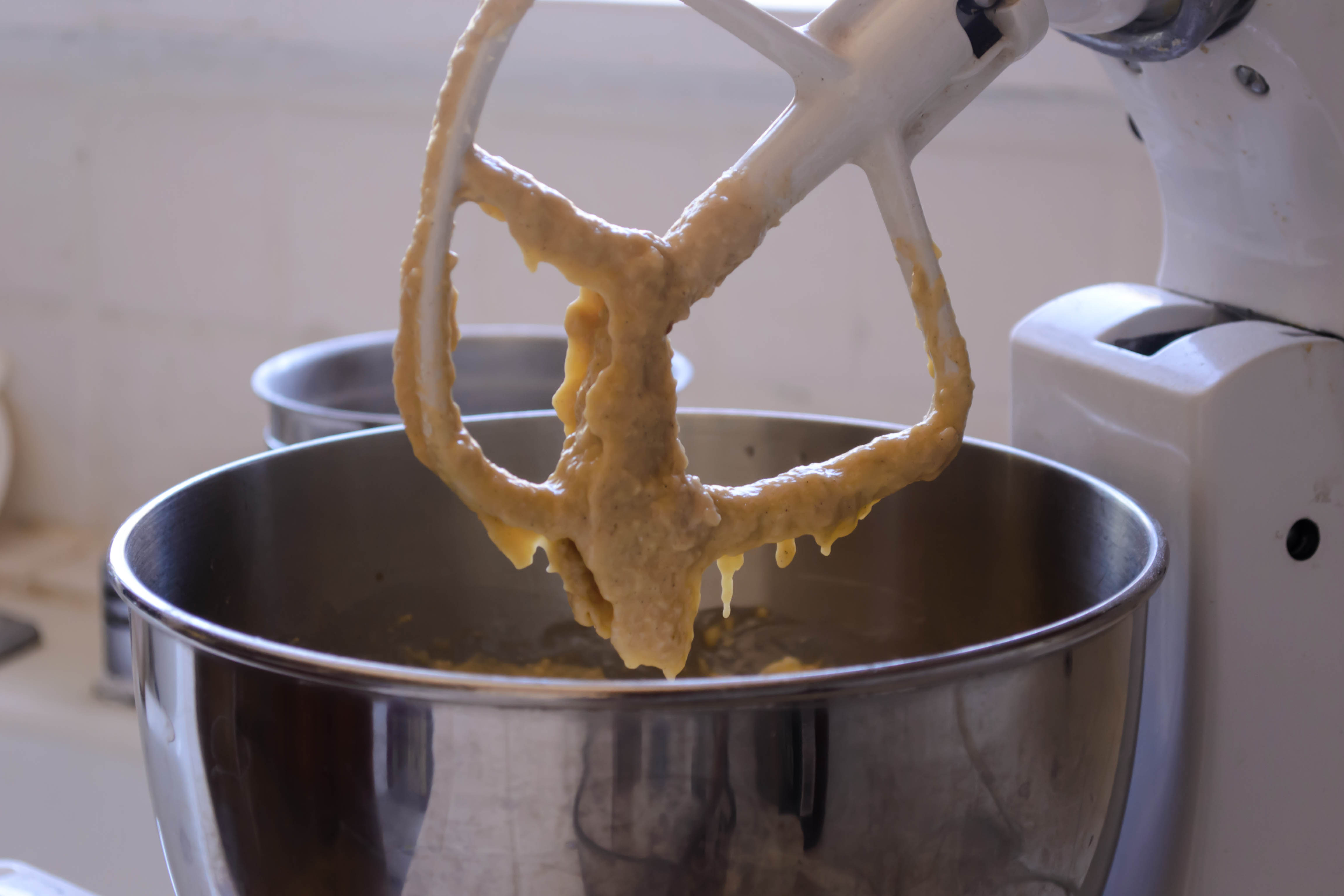 - When the eggs are mostly integrated, add the butter and mix on low speed until it is mostly absorbed into what will look like a wet batter. Add an additional 1 cup flour and mix until combined.