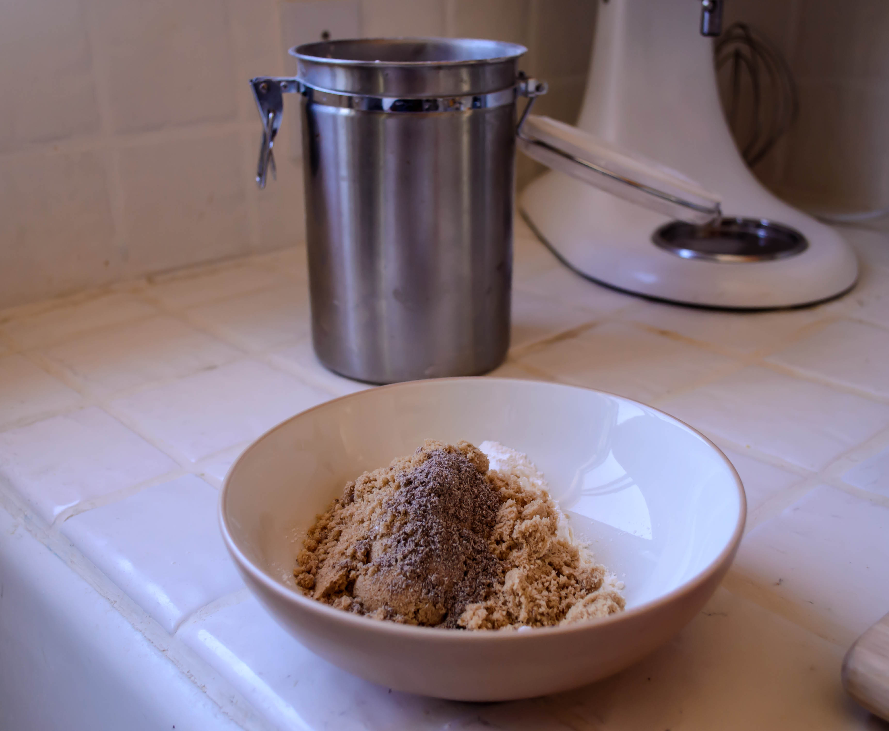- While the cakes rise again, preheat the oven to 350F and make the streusel.