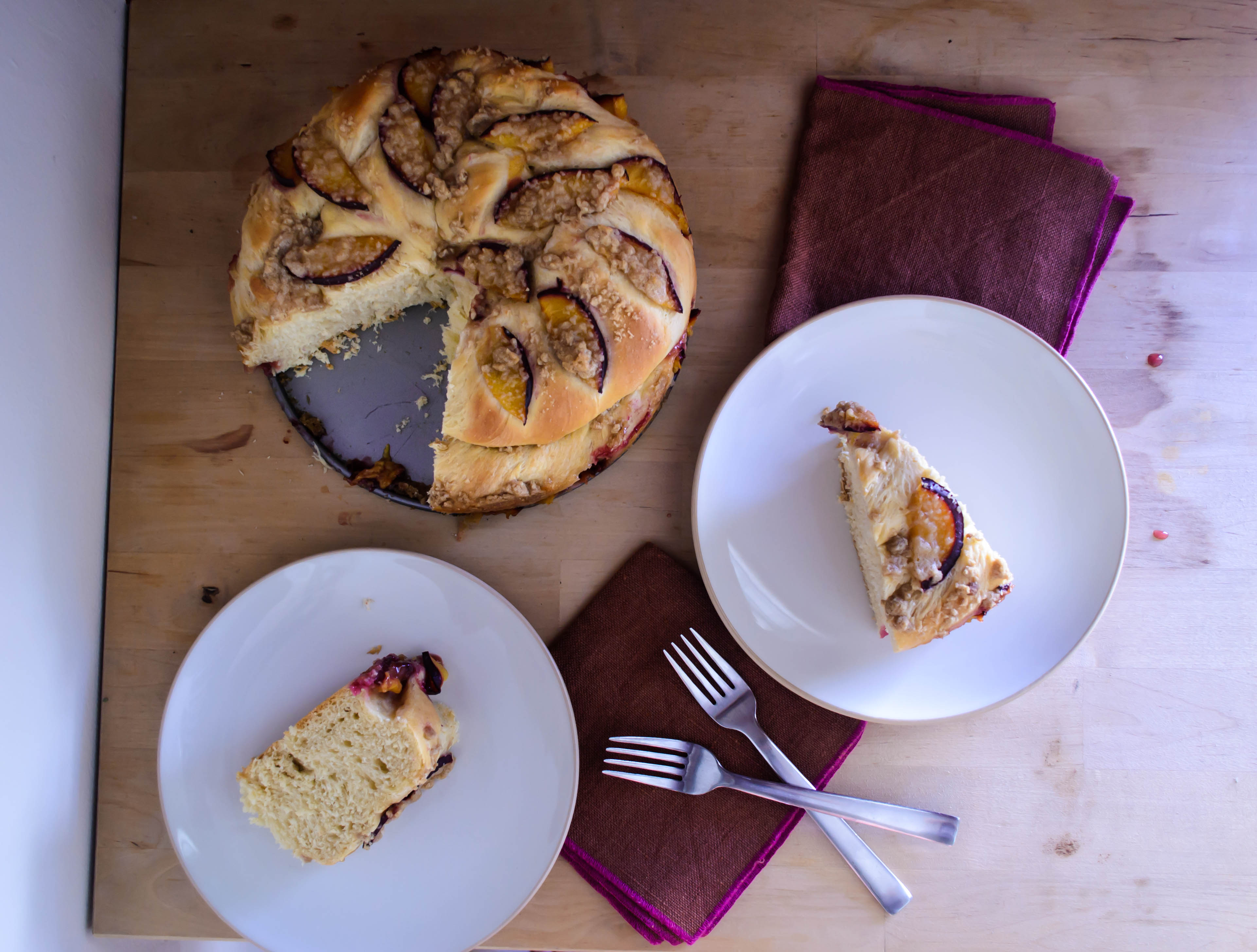 Like Nana used to, I made enough dough for two cakes. Obeying the mandates of memory, I did one in a square pan. I wasn’t sure how it was going to turn out – just a hunk of dough flopped and poked into a pan – so for the other I tried for a twisted coil, laying the flat snail-shell of dough in a springform pan to rise. Interestingly enough, while adding streusel to the top was a successful adaptation, the pan and shape change was not so ideal. The square shape turned out better because it made for a more even distribution of plums. The coil, while it baked into a beautiful puffy spiral, was smaller to start with, which meant I couldn’t load on as many plum slices. When it expanded, both on the counter and in the oven, the plum distribution ended up a bit sparse (though the outcome was still delicious). The square shaped cake, which had nowhere to expand but straight up, retained its fruit coverage for a final product that can only be termed plummier. That, then, was the one I brought to work with me to share. By the time I left campus in mid-afternoon, only a tiny, plum-less corner remained.