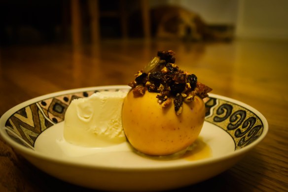 s: Combine chopped pecans and chopped dried fruit (raisins, dates, figs, cranberries all work) and toss with maple syrup and a sprinkle of cinnamon, allspice or nutmeg or all three. Fill the cavities of cored apples with the fruits and nuts, dot each with butter, put into a baking dish and roast about 30 minutes, until tender. Better with vanilla ice cream.”