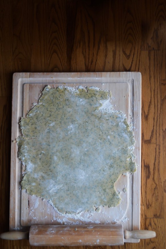 Bittman’s directions and quantities here are pretty specific, so I just followed his directions. I omitted the salt, because Parmesan carries so much of its own tangy hit, and my parents are not big salt eaters. It should also be noted that pulsing this mixture until just combined does not create a rollable dough, unless my idea of “just combined” is different from Bittman’s. However, turning out the just-clinging crumbs onto a floured board and kneading for only a minute or two does produce a nice textured ball of dough that can be rolled out with minimal sticking.