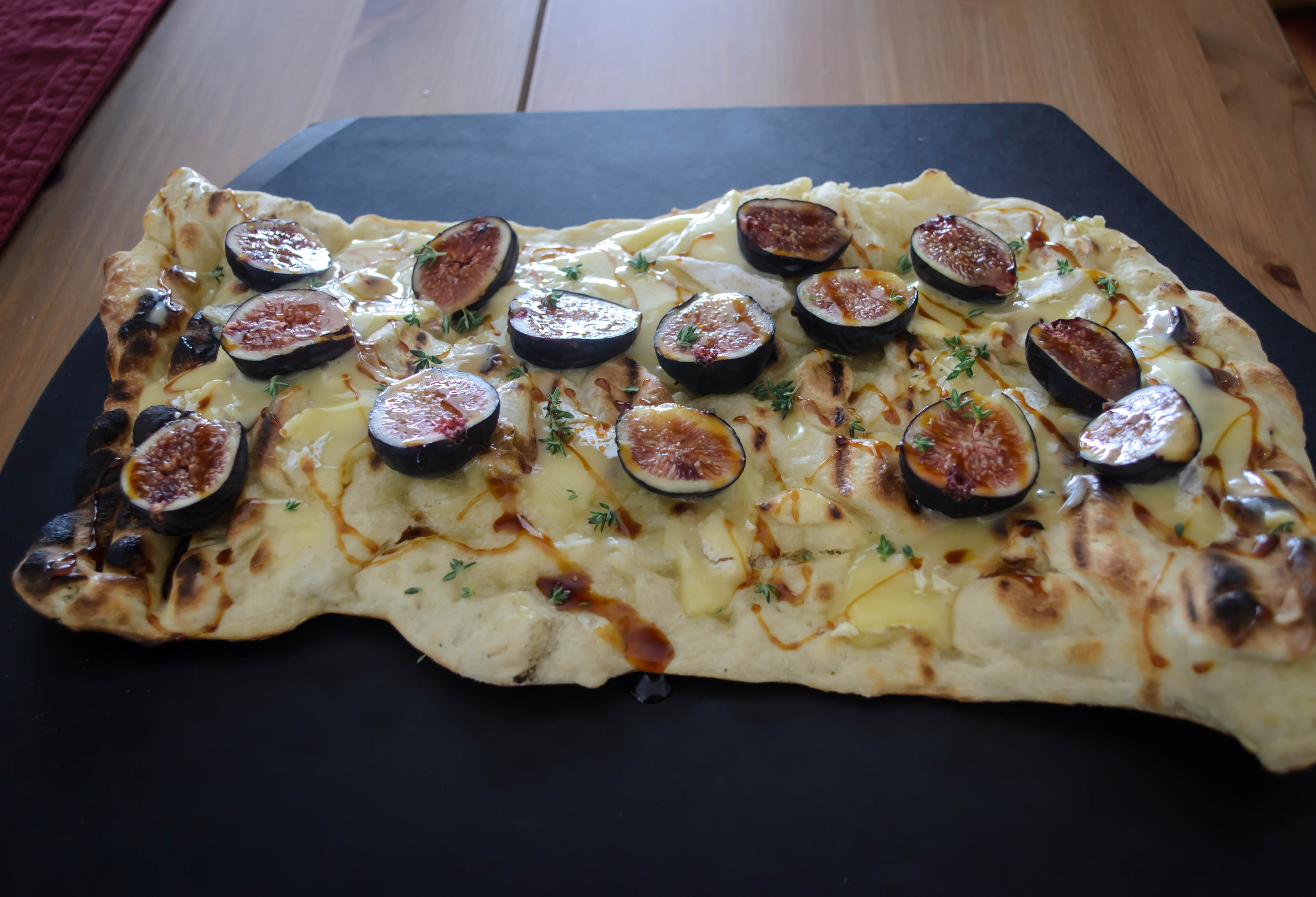 - Once your flatbread crust is browned and blistered to your liking, transfer it from the grill or oven to your cutting surface. Smear the whole top of the dough with the slices of brie cheese (I used the back of a spoon. You could also use a spatula). Nestle the figs in, spacing them evenly over the surface.