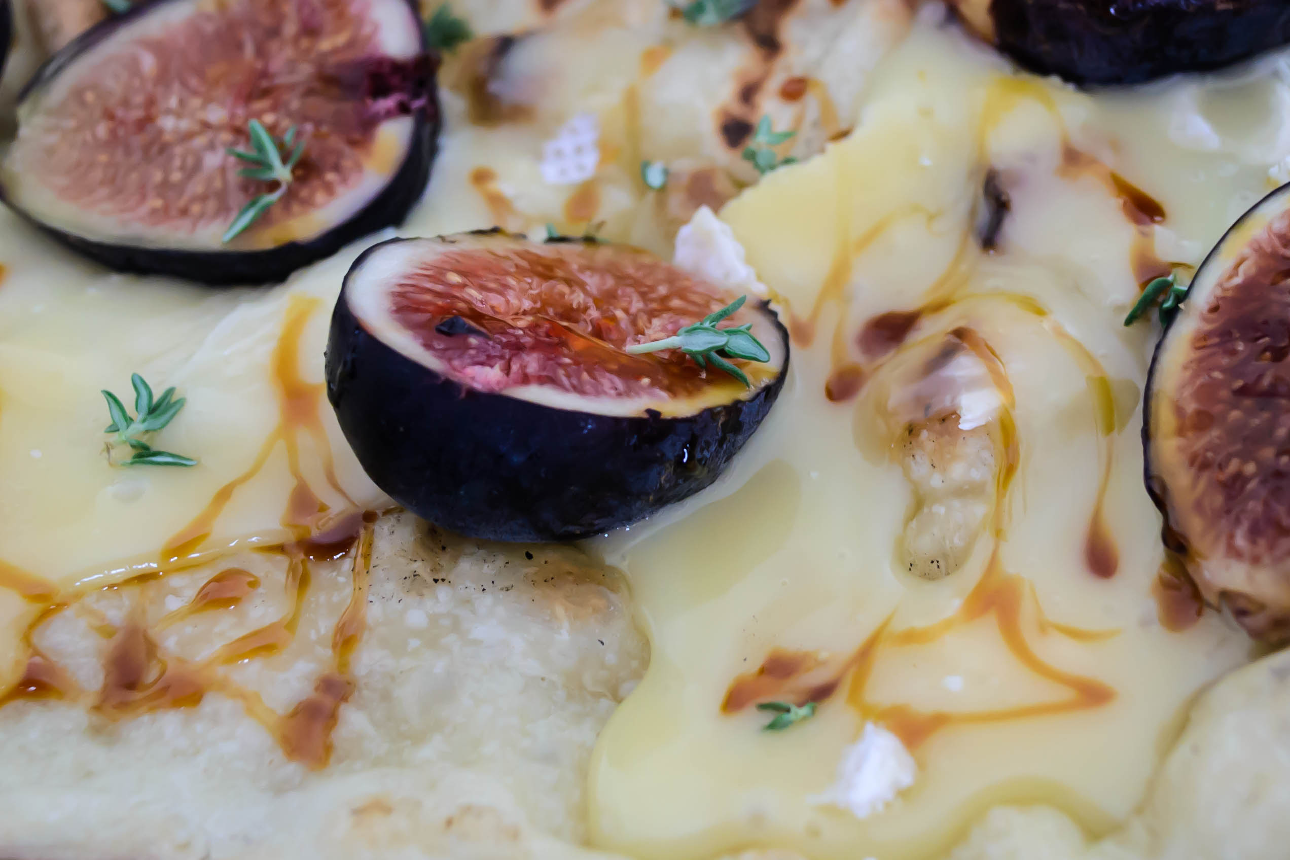 - Once you’ve got your heat source preheating, prep your toppings. Halve the figs, slice the cheese, pinch the thyme into individual leaves or small clumps. This is all going to go pretty quickly once we start cooking, so you’ll want to be ready.