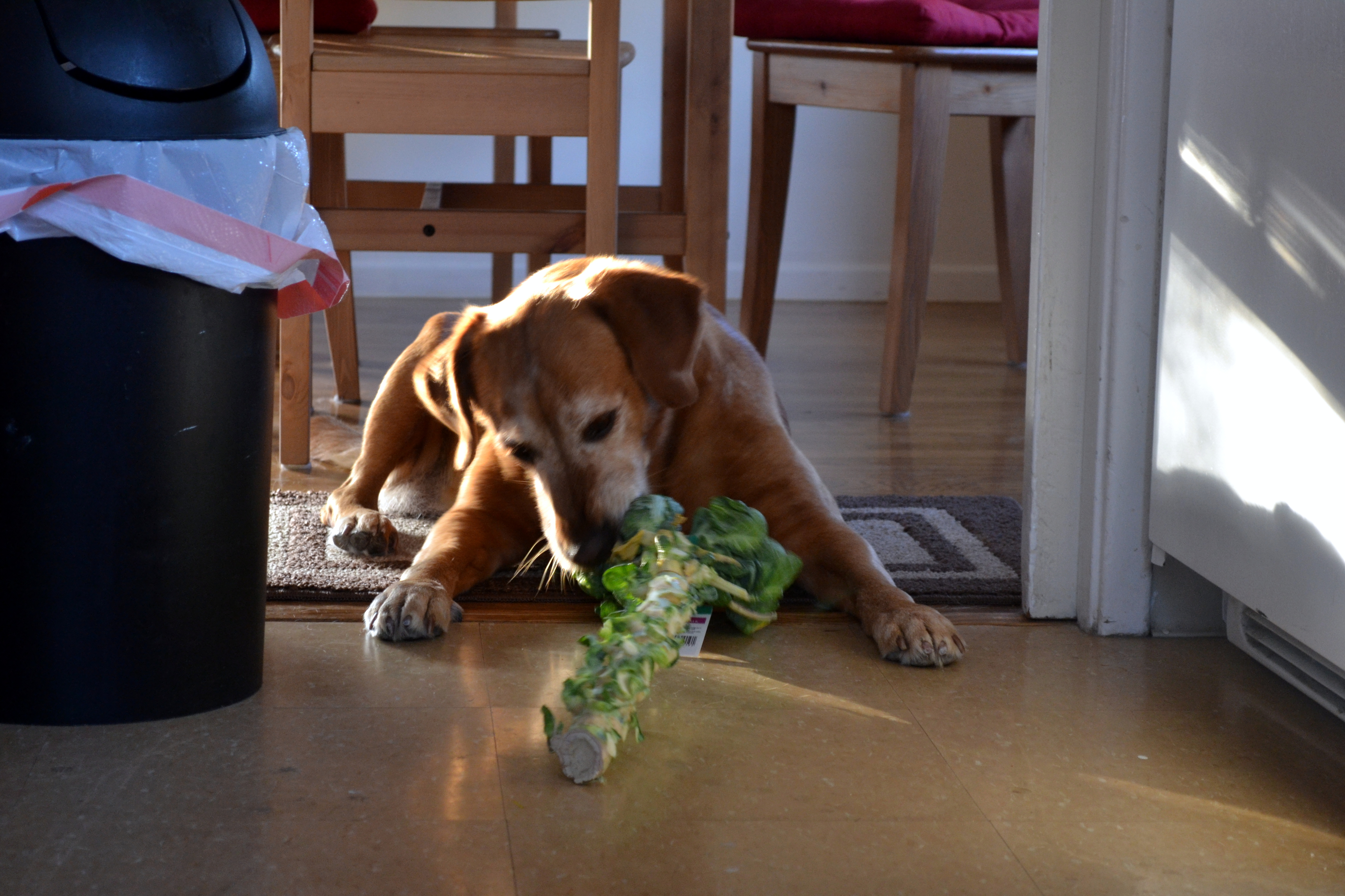 Food Blog February 2013-0682Then Lucy arrives (yes, my “daughter” is a Lucy too!).  Friendly eyes, hopeful wag, up for anything, she stands in the doorway, letting her nose suss out the situation.  I give her a carrot or the thick, stubby stem end of a head of broccoli (her favorite), or once, memorably, a whole Brussels sprouts stalk she was determined to annihilate (I took this away from her fairly quickly).  She hangs around hoping until I light up the stove.  She doesn’t like the gas, so she heads back to the living room where she can’t see the tiny blue flame.