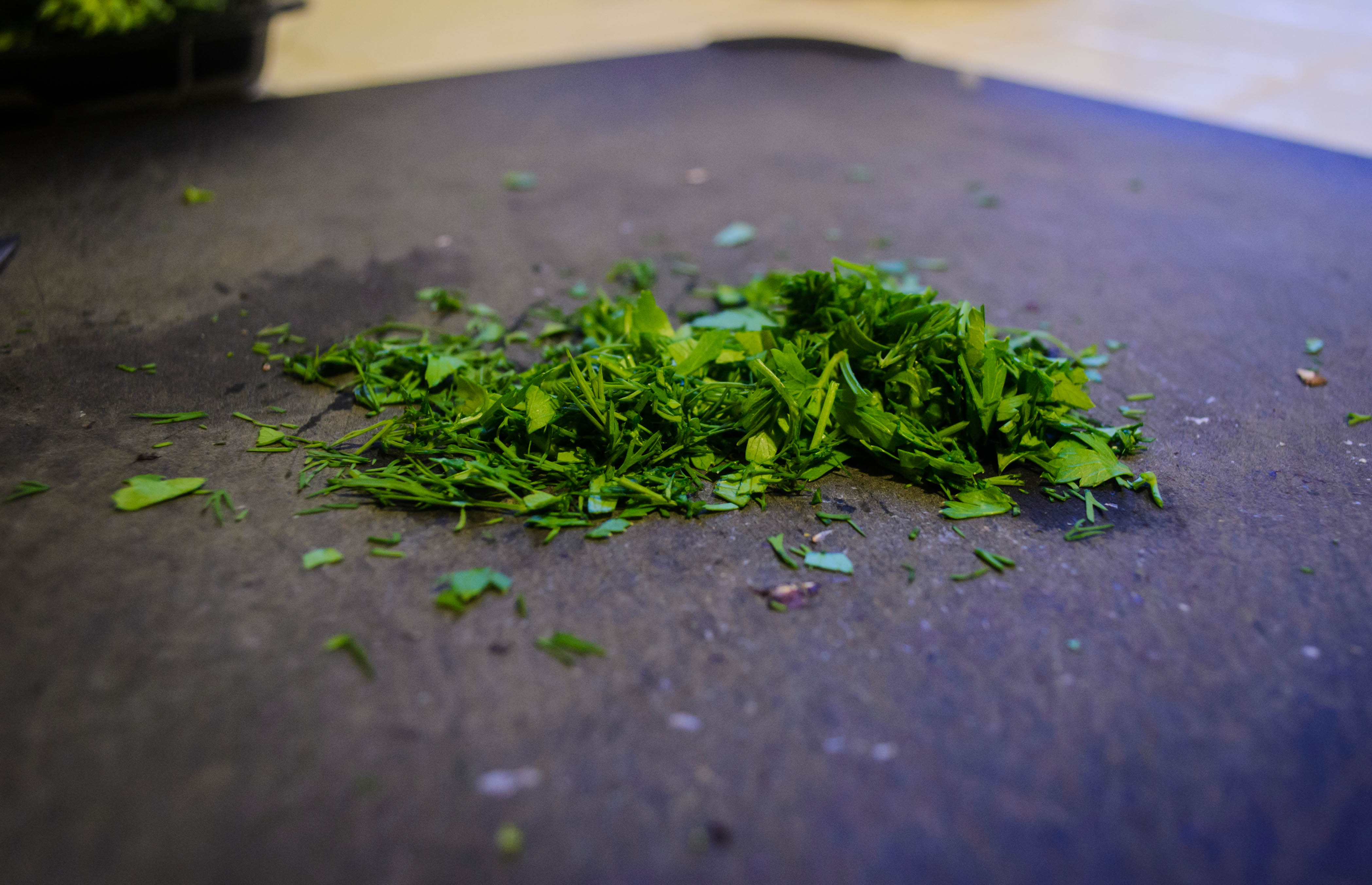 Flavorings are, I think, the most important part of a meatball. Rather than a bland ball of, well, meat, I wanted these to be interesting in their own right. Parsley was a definite, and I decided I wanted some basil as well. Finely grated onion and garlic sweated down in a bit of olive oil would add flavor as well as moisture, to keep the meatballs from getting dry. Finally, there needed to be parmesan cheese. Ina Garten’s Italian Wedding Soup features baked chicken meatballs oozing with cheese, and the salty gooiness is so appealing; I knew I wanted to imitate it with mine.