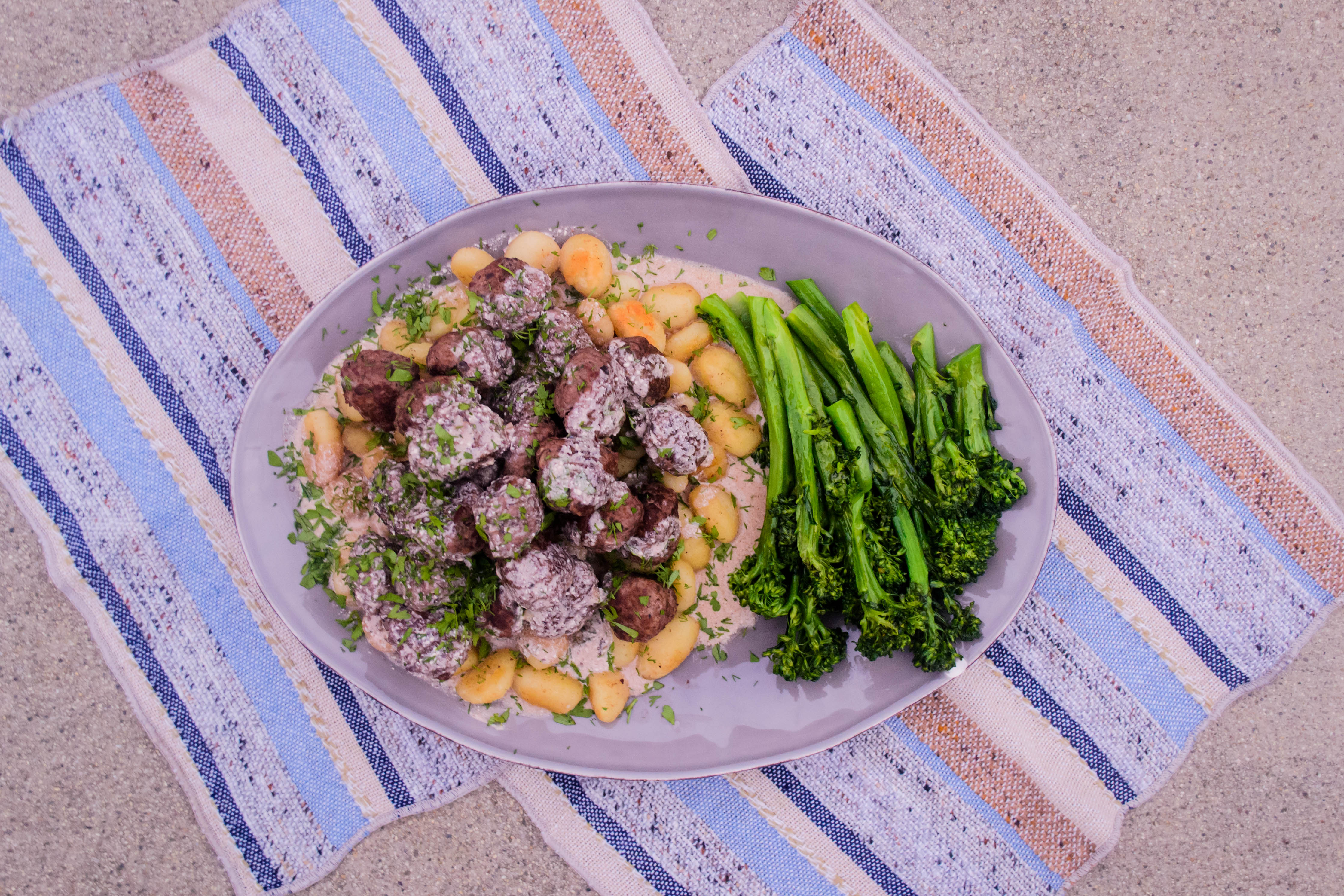 - Roll the remaining meatball mixture into 16 equal sized meatballs (they will be about 3 tablespoons each) . Carefully place them into the skillet, not touching one another (you will probably need to do this in two batches), and sear, undisturbed, for about 2 minutes. When this first side is golden brown, flip over and fry for another 2 minutes, again until golden brown. When browned nicely on all sides, remove to a clean plate and repeat with the remaining meatballs.