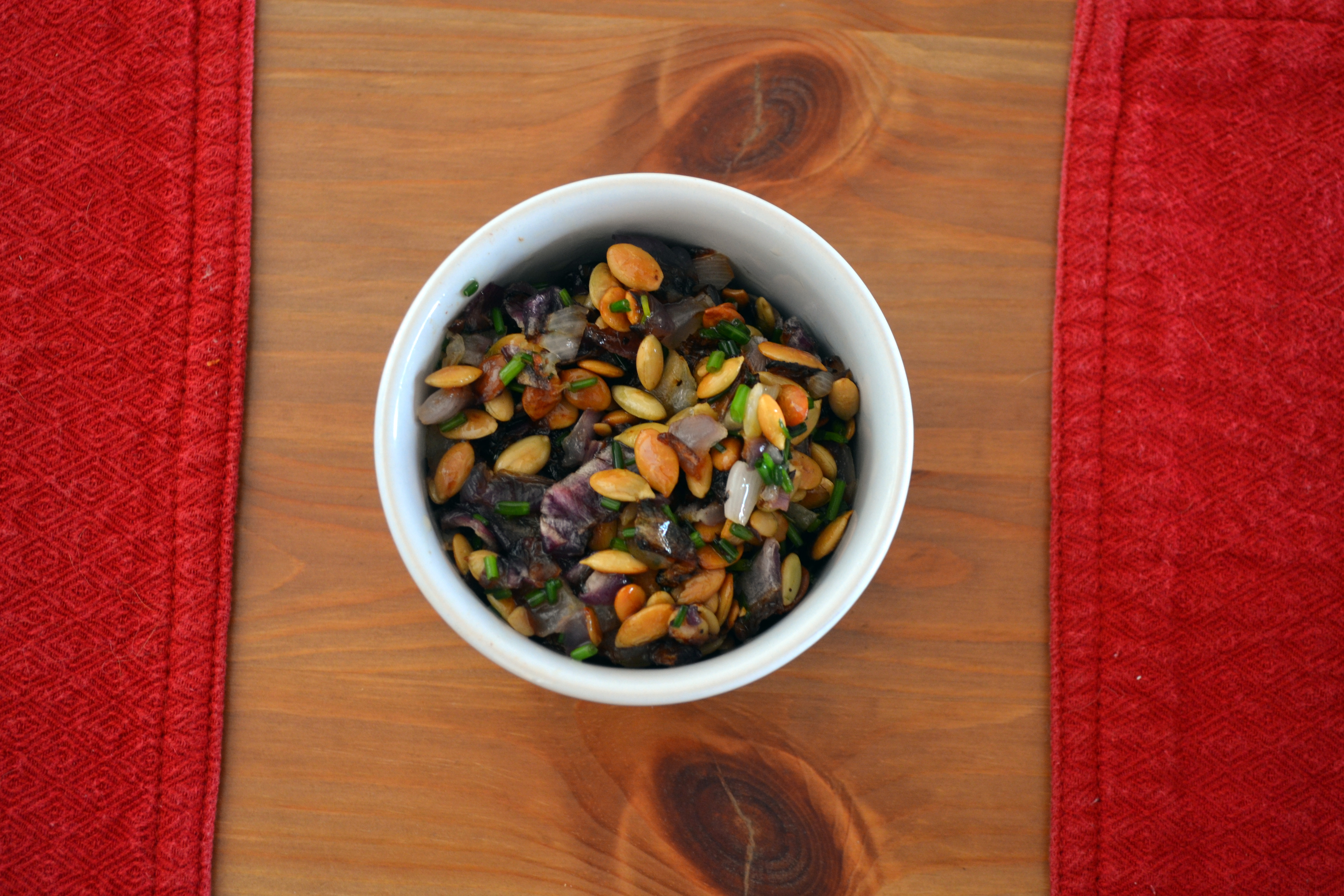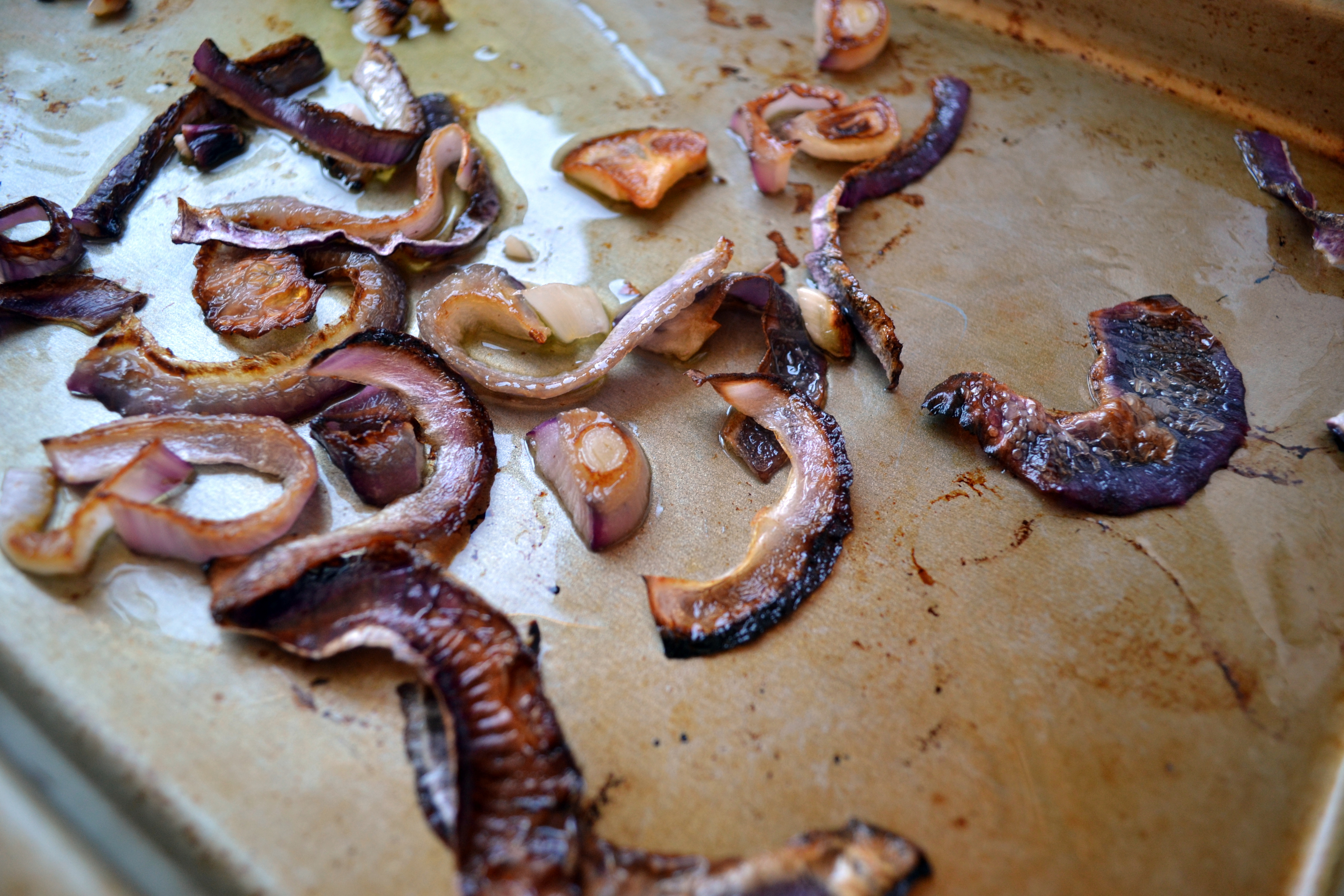 - Preheat the oven to 400F. On a baking tray lined with aluminum foil, toss the apple and onion chunks with the olive oil, the ¼ teaspoon salt, and the pepper. Roast for 15 minutes, toss gently with a spatula, then roast another 15 minutes, until just a few edges are taking on a toasty brown color. Remove from the oven and set aside to cool.