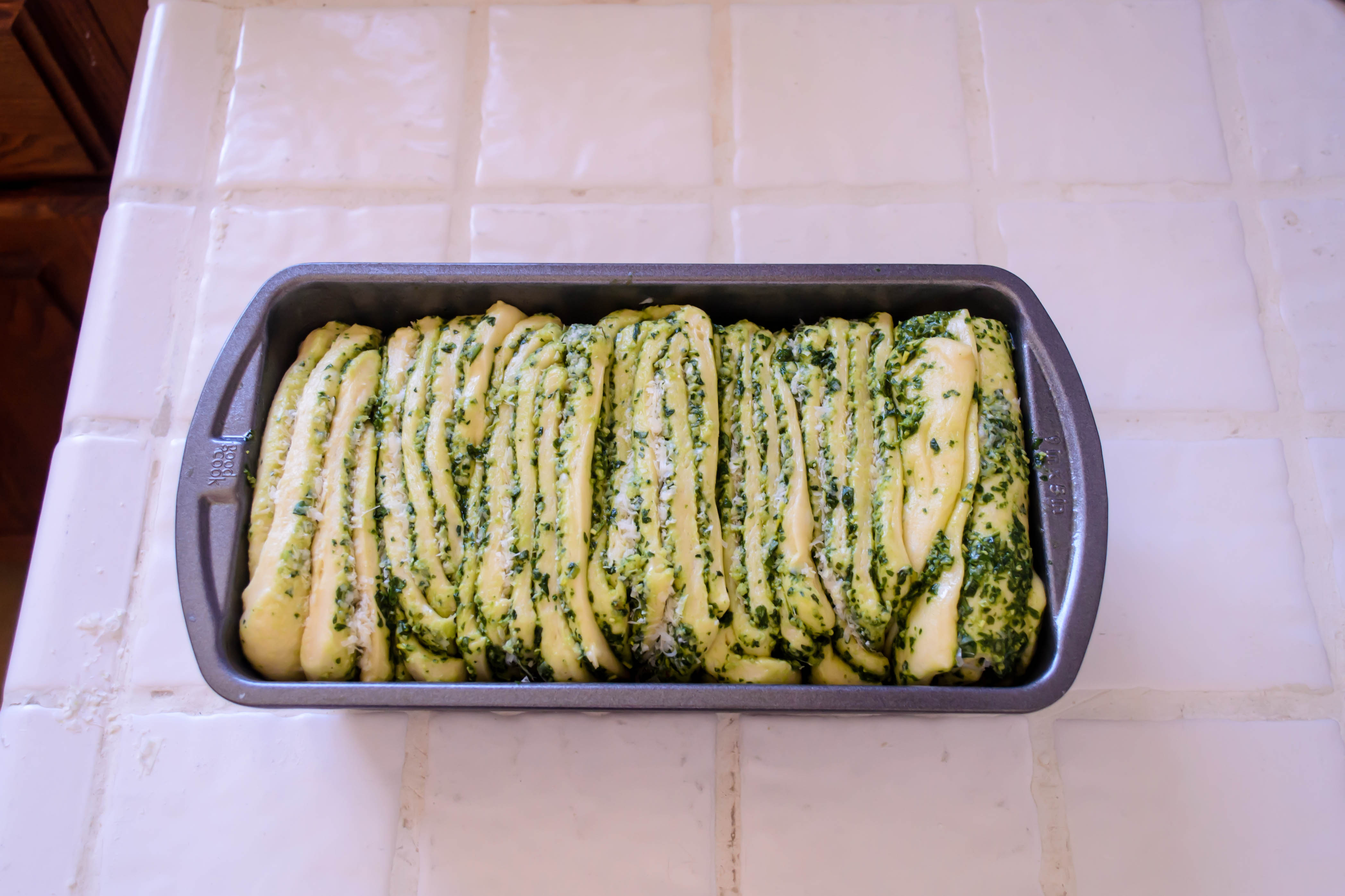 There seem to be two schools on pull-apart bread. One involves rolling little spheres of dough and jamming them into a pan together, so when they cook they swell into one another and form tenuous ties. This is also commonly called Monkey Bread, especially when it is sweet. The other, which I haven’t seen as frequently but which I chose to work with after seeing Deb’s offering, results in something more like a Pillsbury Grands biscuit or puff pastry stood on end. It involves rolling the dough thin, slicing it in long strips, layering those strips and slicing them into squares, then levering those stacked squares – like servings of lasagna or birthday cake – sideways into a loaf pan like a deck of cards to rise into one another and smash together during baking. As you peel the warm layers apart, you get the bite of pesto and the salty richness of parmesan.