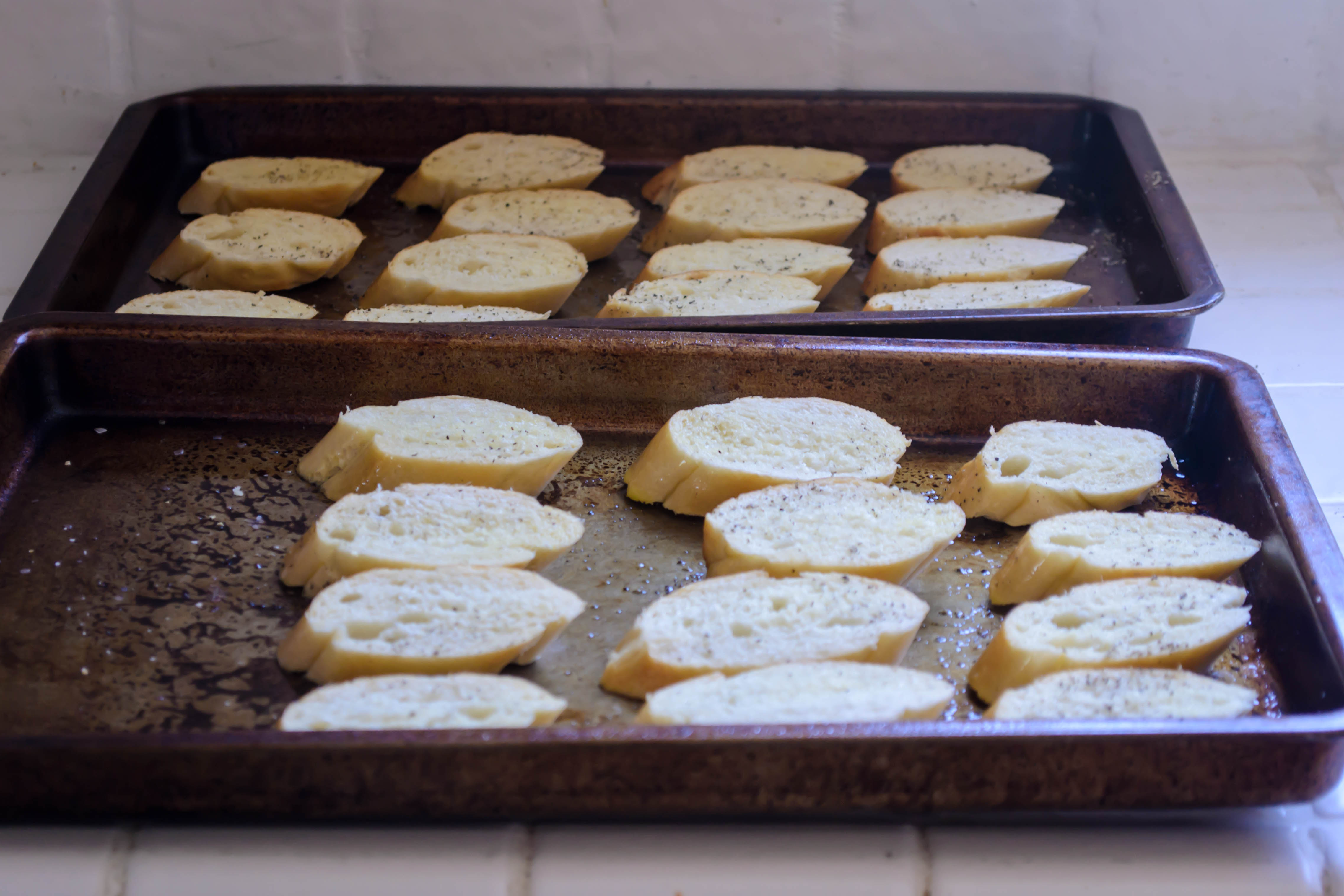 - Spread the seasoned bread cubes out on a baking tray and toast in the 300F oven for 20-25 minutes, until they are thoroughly dried inside.