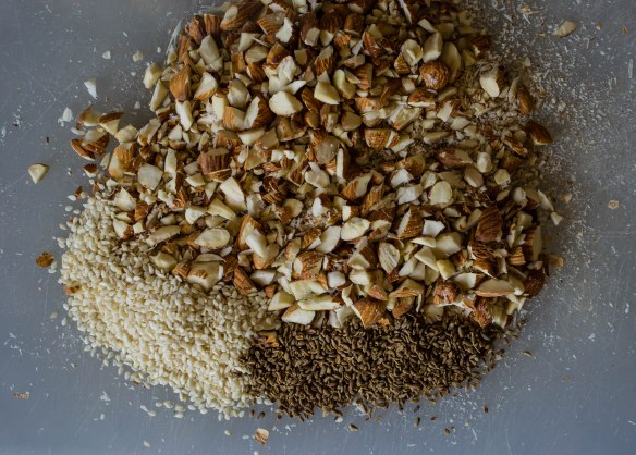 - In a large bowl or the bowl of your stand mixer, combine the flour, yeast, sugar, sesame seeds, anise or fennel seeds, and chopped almonds. Whisk or mix to combine with the dough hook. Once well combined, add the salt and whisk in.