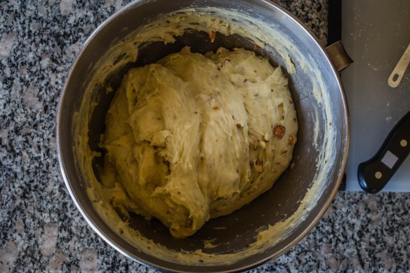 Because Purim involves exuberant eating and drinking, many of the recipes I found for this bread, which is essentially an unbraided challah with added flavoring agents, make a LOT. I’m talking, 8 cups of flour, 3-4 loaves a lot, or even more: some recipes offer the more modest quantities for 3-4 loaves, and then provide instructions for a full 5 pounds of flour. I scaled mine back a little bit to just 2 loaves, one of which, eyeballs already extracted, is sitting happily in our freezer waiting for a weekend when we want something more celebratory than my standard sourdough toast.