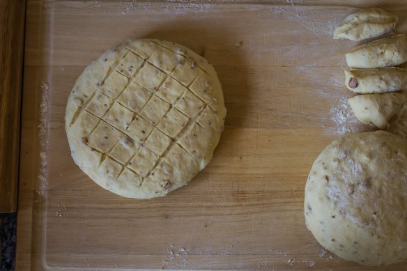 - Divide the remaining dough in half. Working with one half at a time, roll into a ball, then use a rolling pin or floured hands to flatten into a disk 8-9 inches in diameter. With a razor blade or a sharp knife, slice a shallow crosshatch pattern into the surface of the dough.