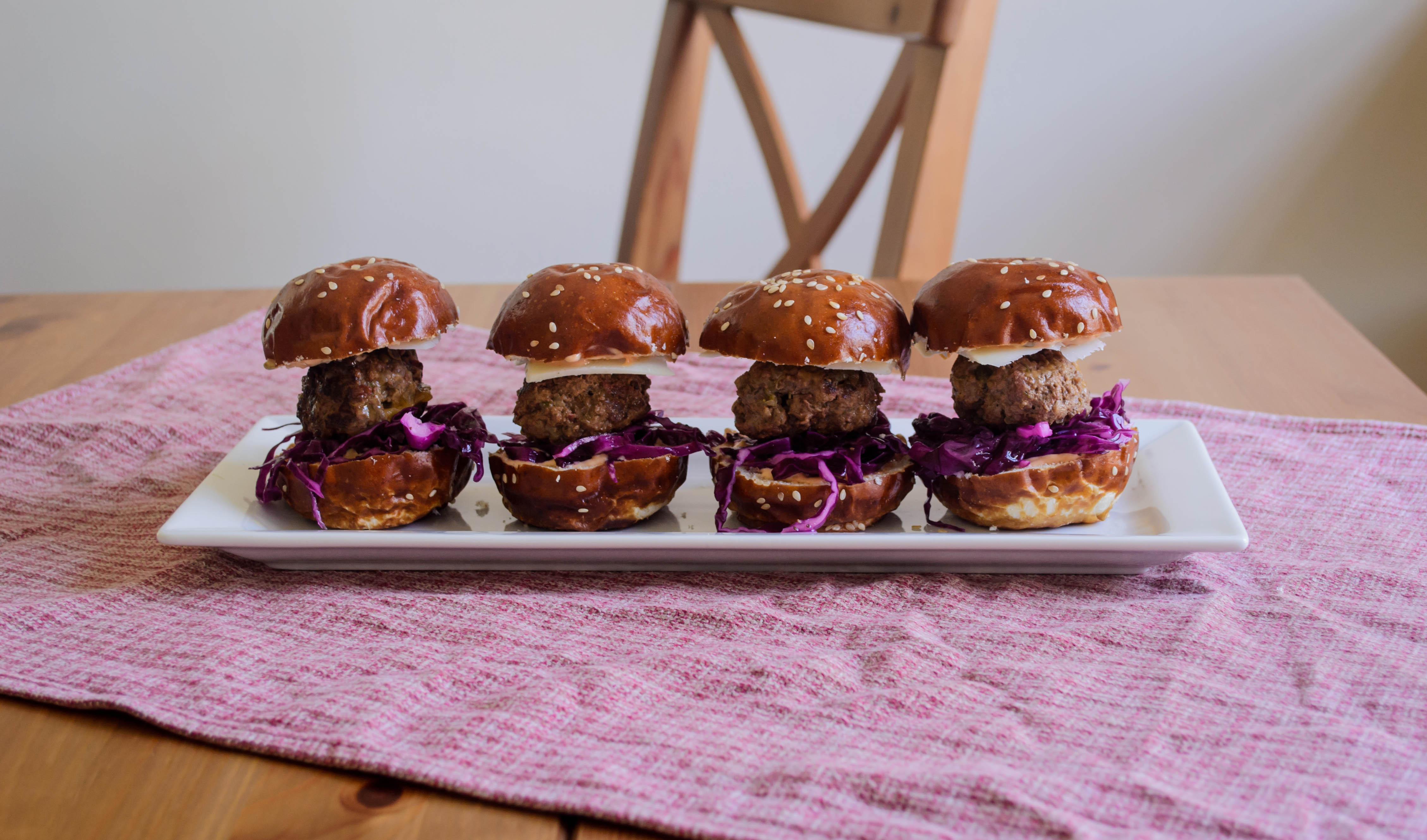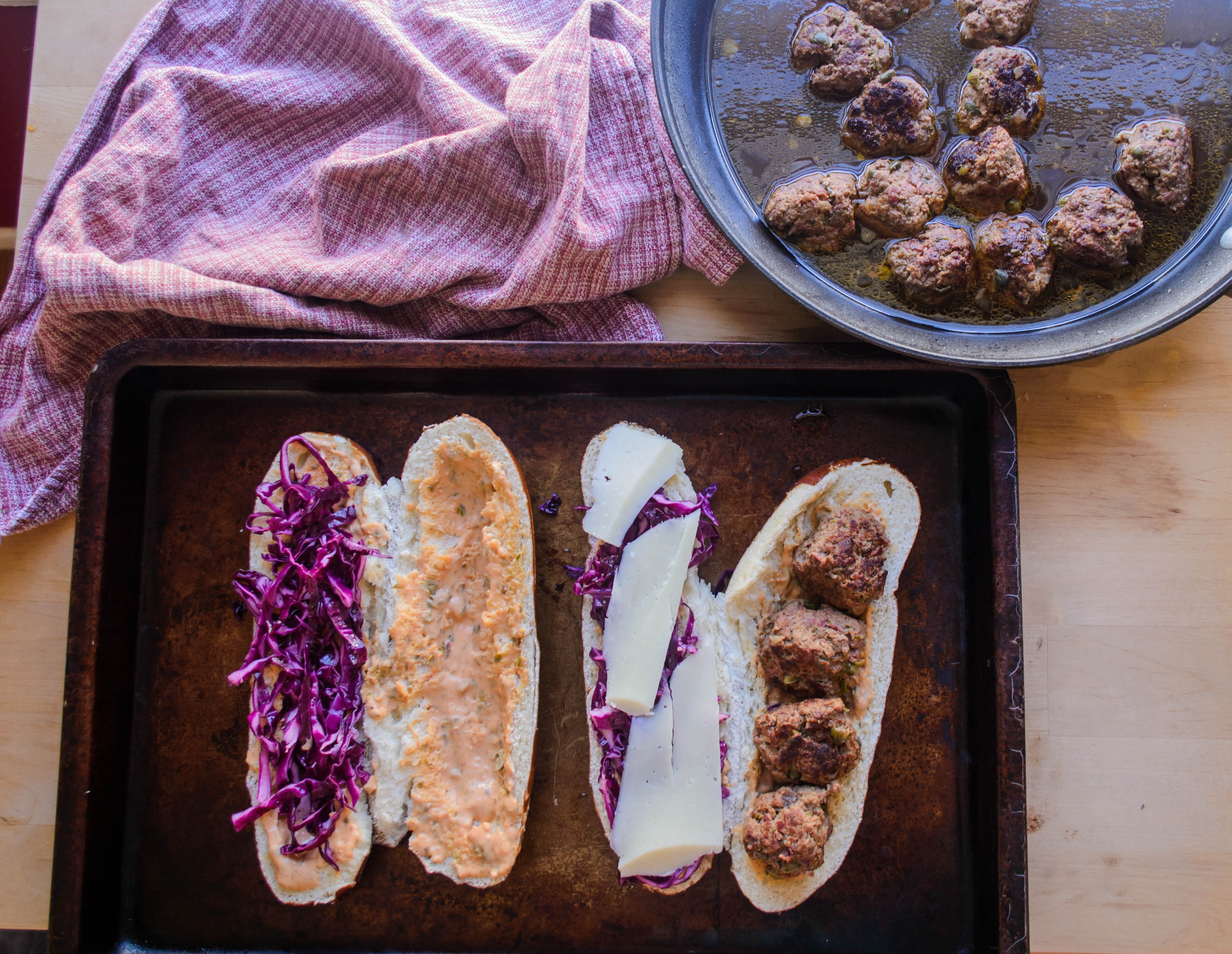 - To assemble, smear a tablespoon or two of tahini yogurt spread on each side of the sandwich rolls. Stack a few slices of vegetables onto the bottom of the roll, being sure you have both zucchini and eggplant on your sandwich. Strew on a few slices of pickled onion, about 2 tablespoons of crumbled goat cheese, and drizzle over about a tablespoon of pomegranate molasses. Clamp on the top of the roll, cut the sandwich in half with a serrated knife for easier eating, and serve immediately.