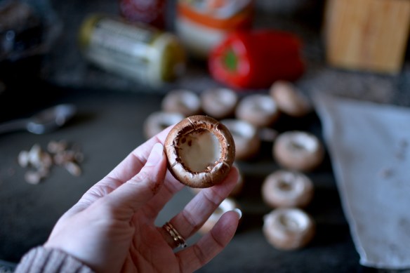 - Using a small spoon, carefully scrape the gills and some of the innards from each of your mushroom caps. We need lots of room for filling. Finely chop the “guts” you’ve removed.