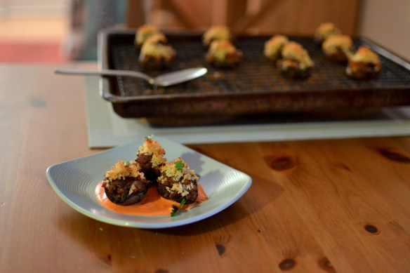 We tried out two serving options, just to see which we preferred: a puddle of sauce topped with a few stuffed caps, and a row of caps drizzled with sauce. Though we decided the puddle of sauce on the bottom would be better for hors d’oeuvres that were going to sit around for any length of time, as the sauce-on-top styling could damage the pristine and glorious crispness of the panko topping, we preferred the sauce-on-top delivery method as both prettier and easier to eat. In either case, a final dusting of parsley made for a prettier presentation and a welcome little herbal freshness to the bite.
