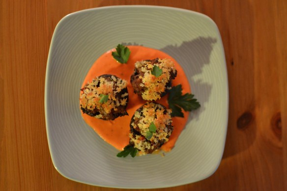 Though this definitely took me more than the twenty minutes allotted on the show (could I have done it in time if pressed? Maybe… with a much bigger mess…), it came together well. It’s hard to fault pork sausage cooked with aromatic vegetables, especially when it gets mounded with panko soaked in what seems like an excessive amount of oil and baked until feverishly crispy. At first taste we weren’t sure the sauce matched the mushrooms – the roasted red pepper has such a strong vegetal clarity that, blended down and even spiked with hot sauce, it can stand up to and overpower its supporting players. Yet we kept going back to it, sliding the mushroom caps through and dotting on another spoonful, and when we each tried a mushroom bare, it was good, but we wanted that kick from the bright, orange-red smear left on the plate. Ultimately I think the sauce was on the right track, but needed a little something to combat the overly heavy vegetal quality, so the recipe below cuts the pepper-forward flavor with the addition of broth. I suspect this will help it meld with the mushrooms better.