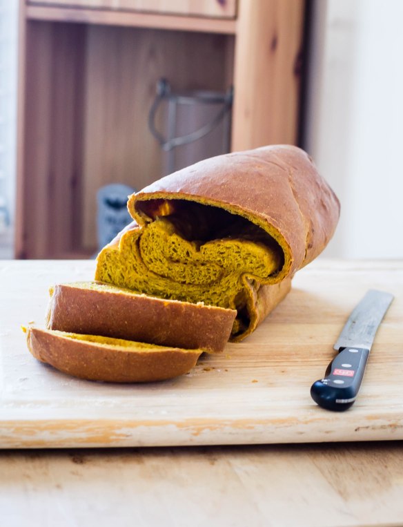 So I’m on board the pumpkin spice train, and although I’m not terrifically enthused about them being swirled through my latte, a liberal dosing in pies, cookies, cakes, muffins, or breads of almost any kind is a-okay by me. And since my Trader Joe’s had a big end cap display of their pumpkin butter this week and Los Angeles is STILL resisting its usual September heat wave tendencies, I decided to take advantage of the season my calendar reports we’ve just fallen into (get it? get it?) and bake up a yeasted loaf infused with all those spices pumpkin benefits from.