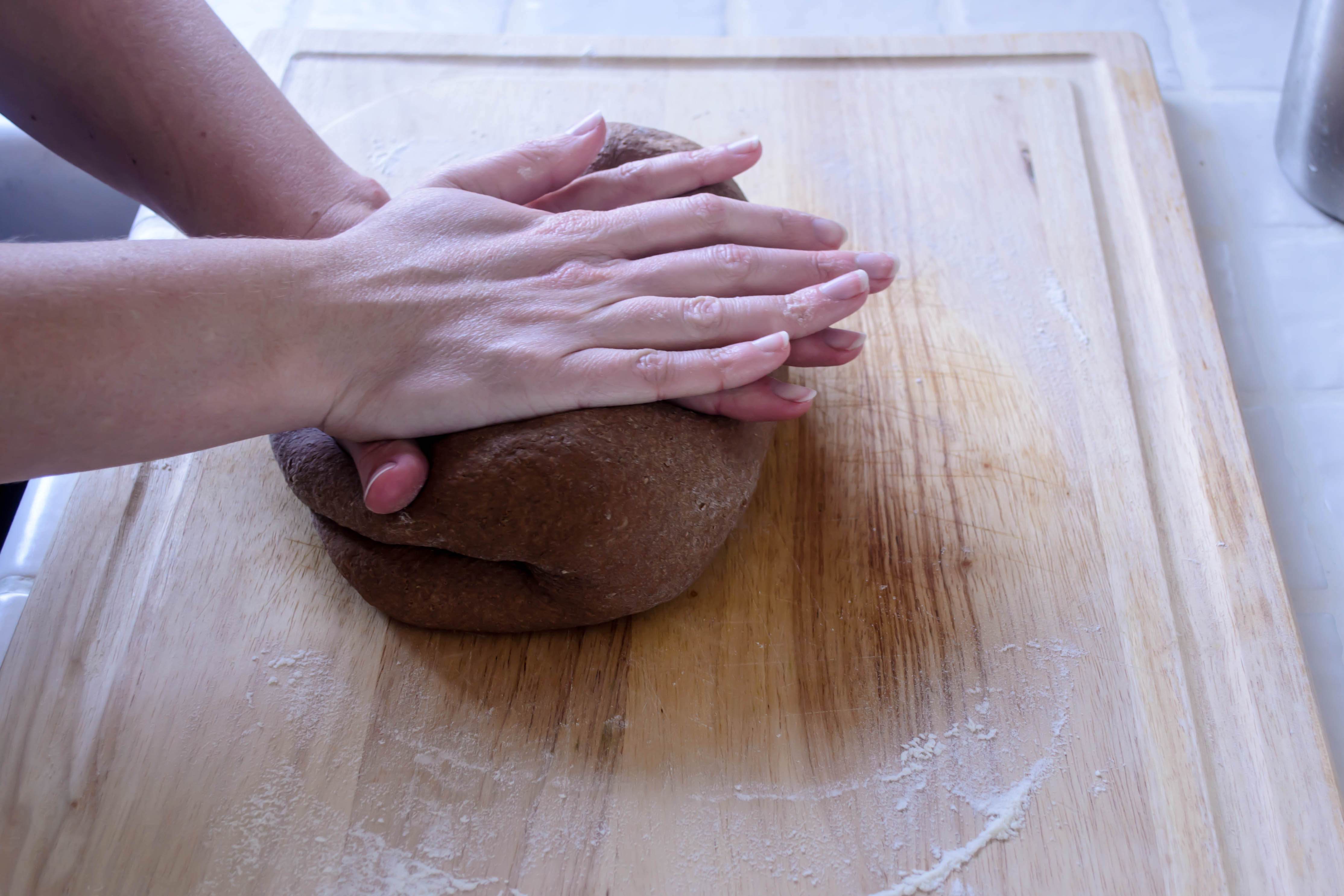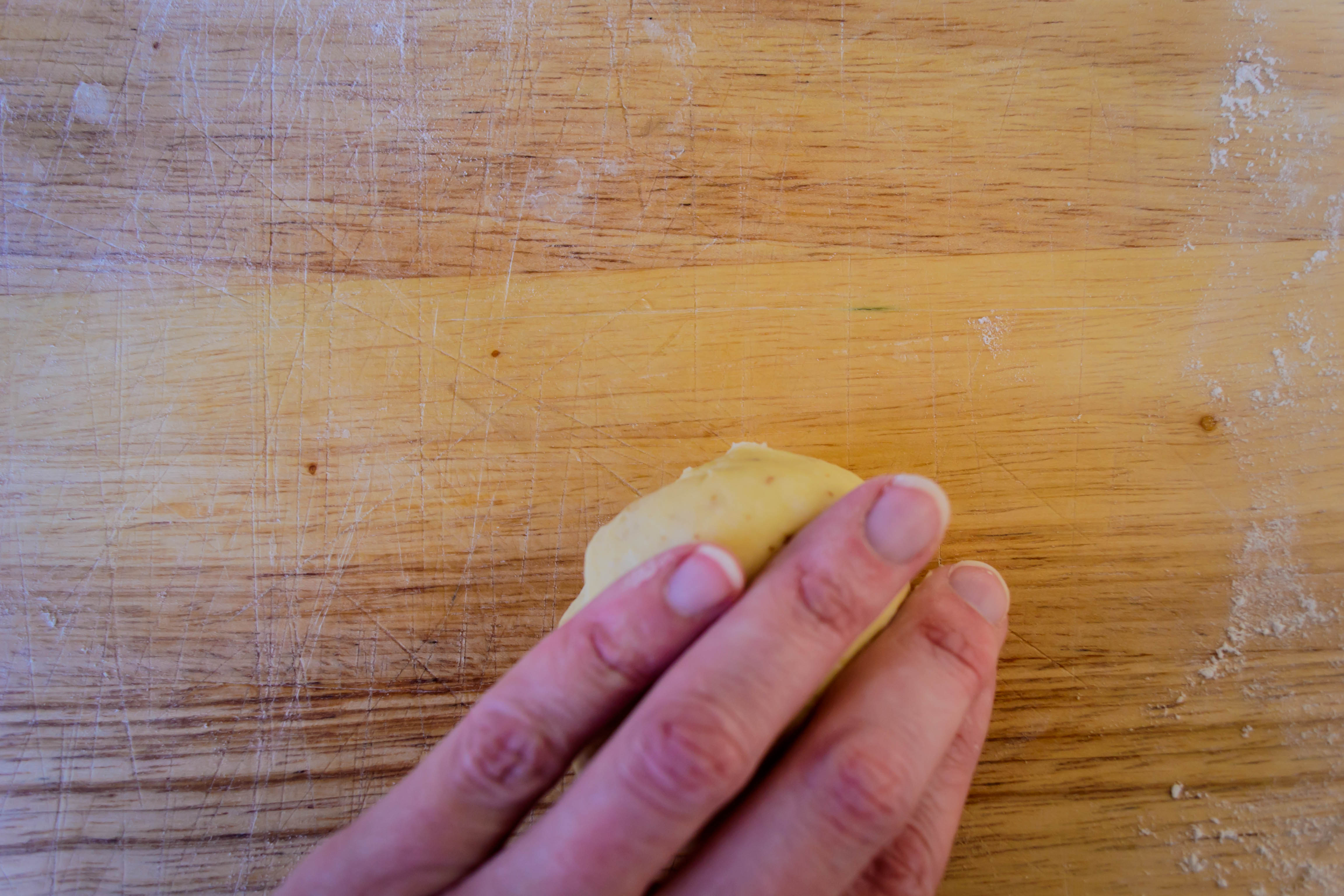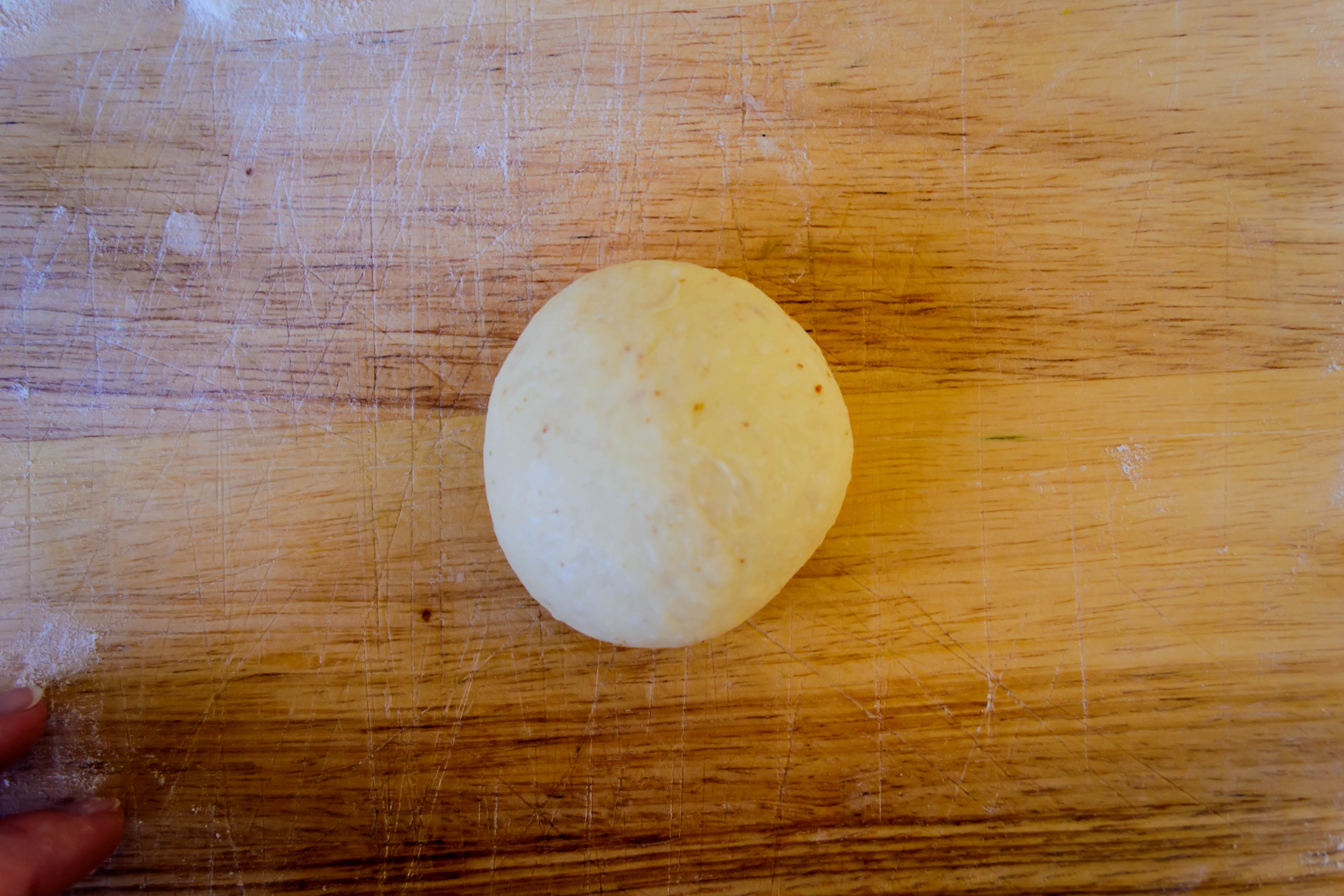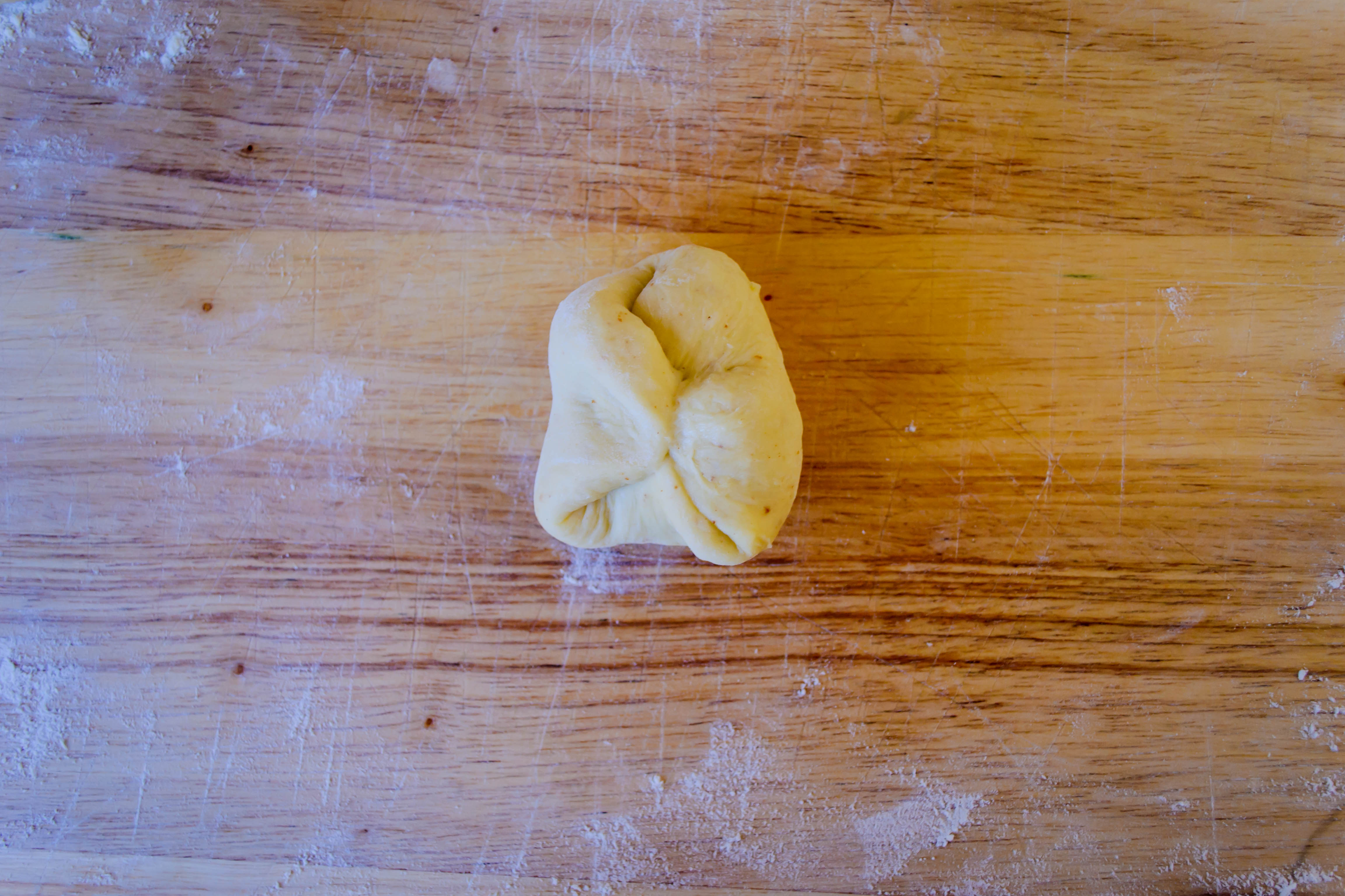 - Day two: remove the dough from the refrigerator and relocate it to a well-floured board. Divide it into four pieces. Working one at a time, pat two of the pieces of dough into about a 4-inch round. Around the circumference of the dough, fold in the edges toward the center to form a clumpy ball (see photo series above). Turn the dough ball over and form your hand around it like a cage, then roll gently with very little pressure in light circles on the board to form a smooth, taut round (see Joe Pastry’s excellent tutorial if you need help with this). Repeat with the second piece of dough.