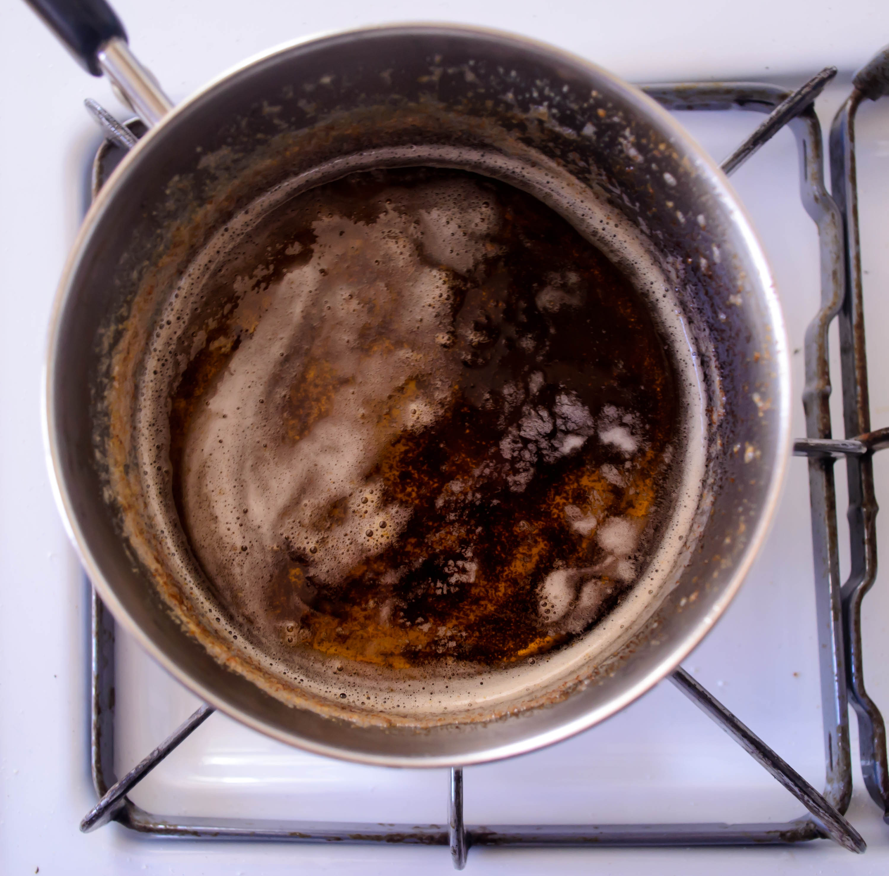 - Day one: melt the butter over medium heat in a small saucepan, preferably not with a dark bottom (it makes it easier to see the butter browning). As it melts, it will sputter and foam up. The foam will eventually subside, but shortly thereafter it will get foamy again. At this point, tilt the pan a little bit (carefully) to see the bottom – little specks of solids should be getting golden-brown. Let them get golden and then chestnut brown, then turn off the heat and set the pan aside to cool. These little dark bits are what makes it brown butter.