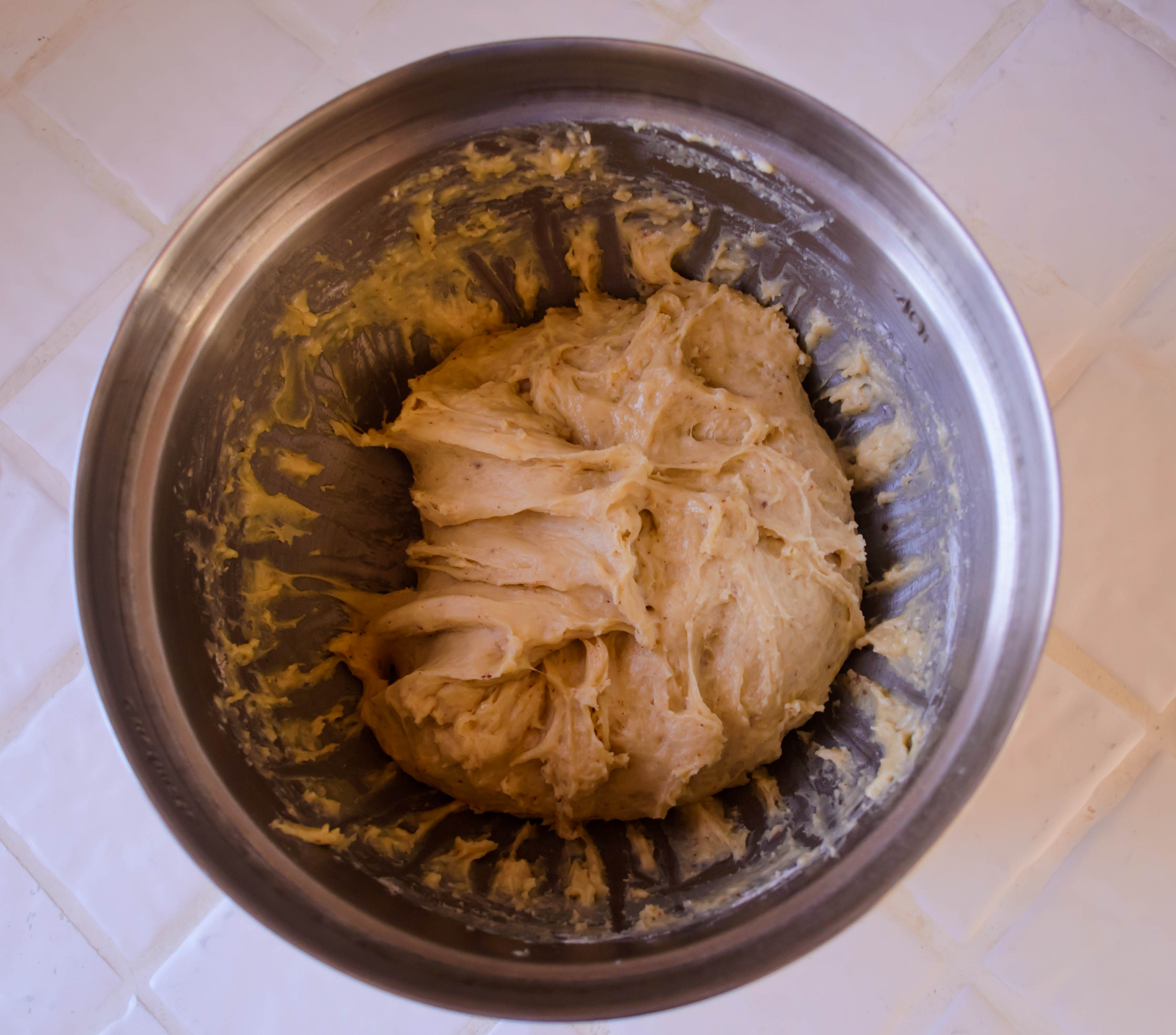 - Meanwhile, whisk together the flour and salt in one bowl (a large one), and 6 of the eggs in another (a small one will do). When the yeast mixture is bubbly and smells like warm bread, add the whisked eggs and stir to combine. Whisk in the cooled brown butter, then dump the whole wet mess into the bowl with the flour and salt. Stir with a wooden spoon until no flour streaks remain. It will be a damp lump that looks more like thick cake batter than like dough.
