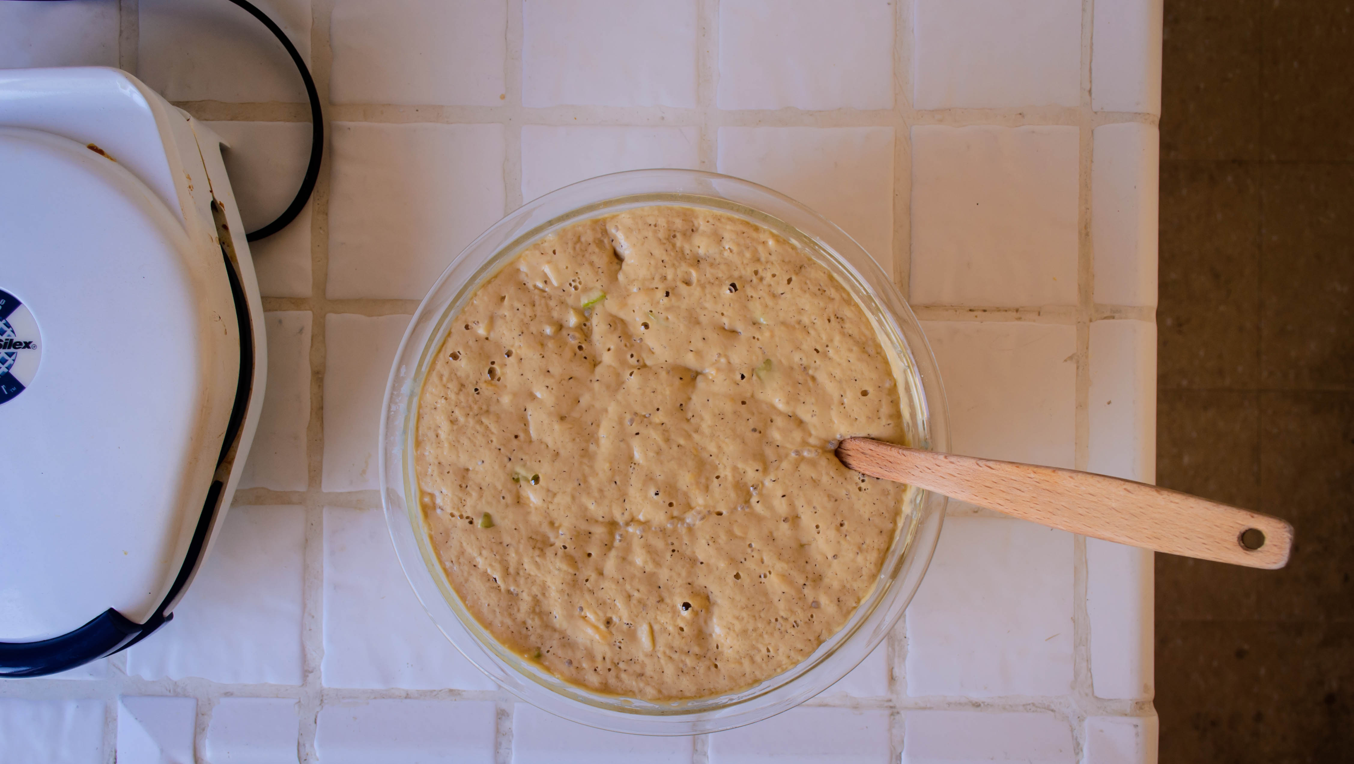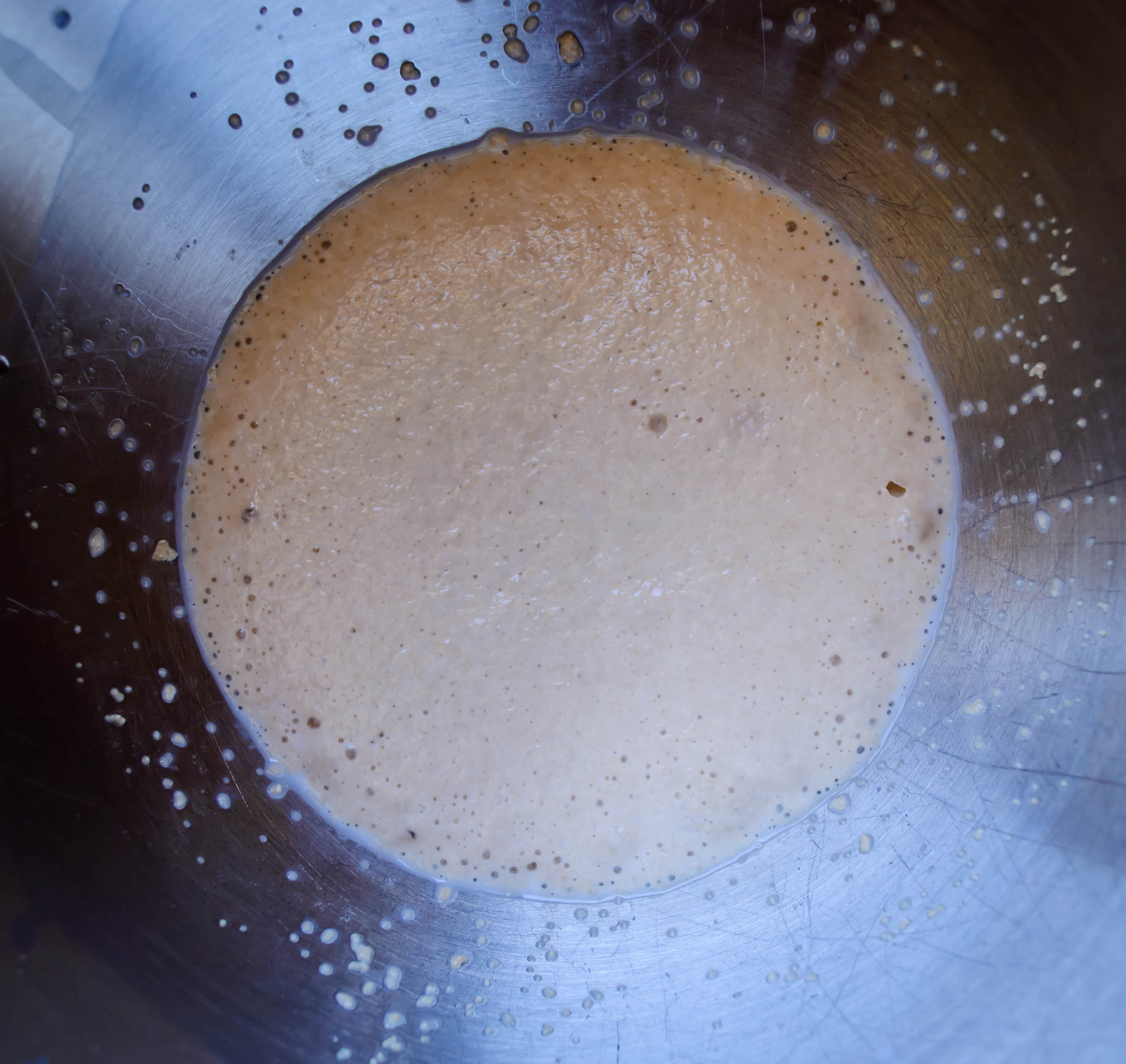 - Cover the bowl with plastic wrap and set it on the counter for 1½-2 hours (how fast it rises and bubbles will depend on how warm your kitchen is, but longer rise = deeper flavor). The mixture will develop lethargic and then more energetic bubbles, and begin to smell quite bready.