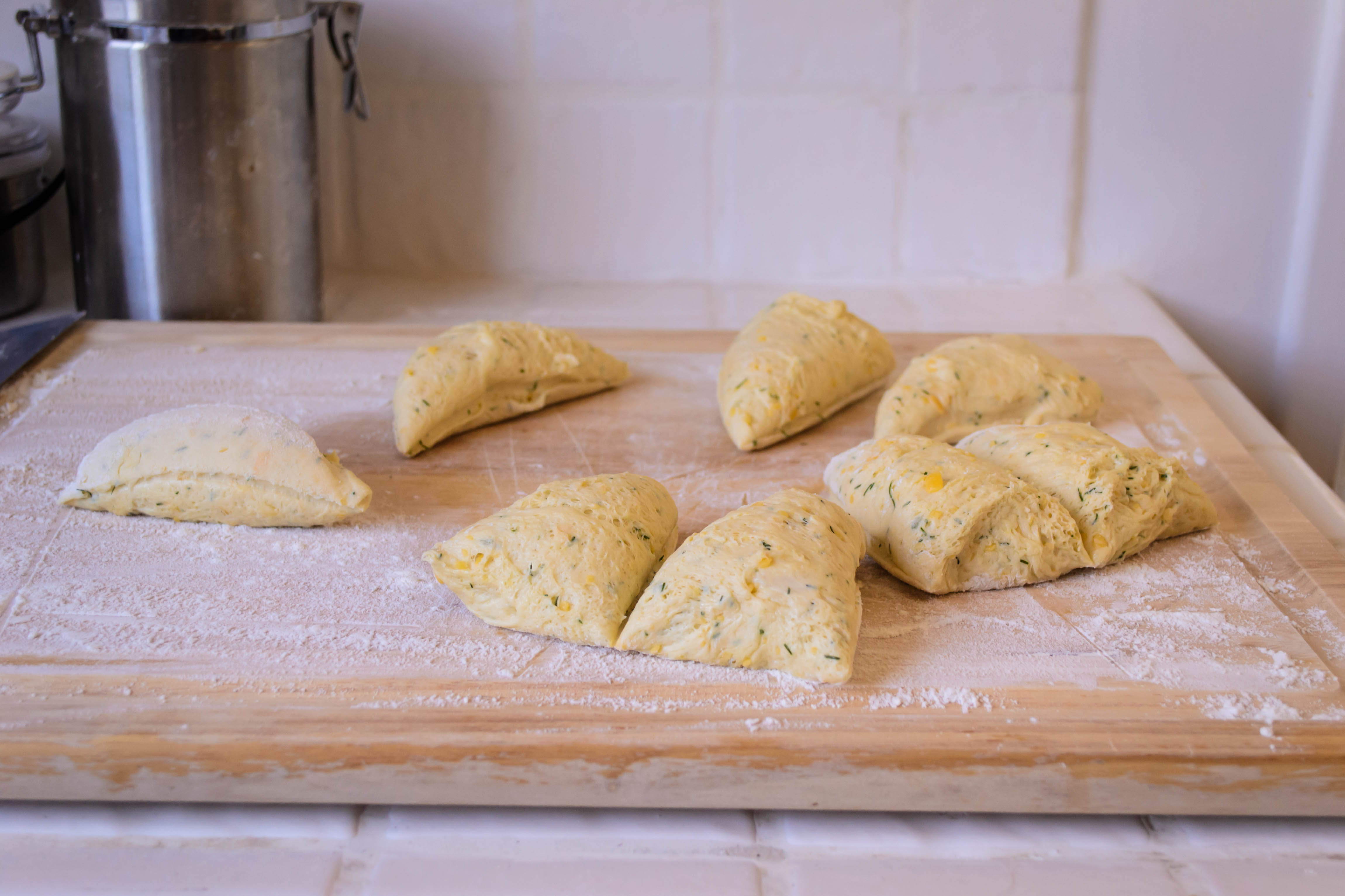 - Add the beer and yeast mixture and whisk to combine, then add the flour 1 cup at a time, whisking to combine thoroughly. Switch to a rubber spatula and fold in the apple chunks and the cheese. Stir well, as the cheese may want to stick together; we want it evenly incorporated.