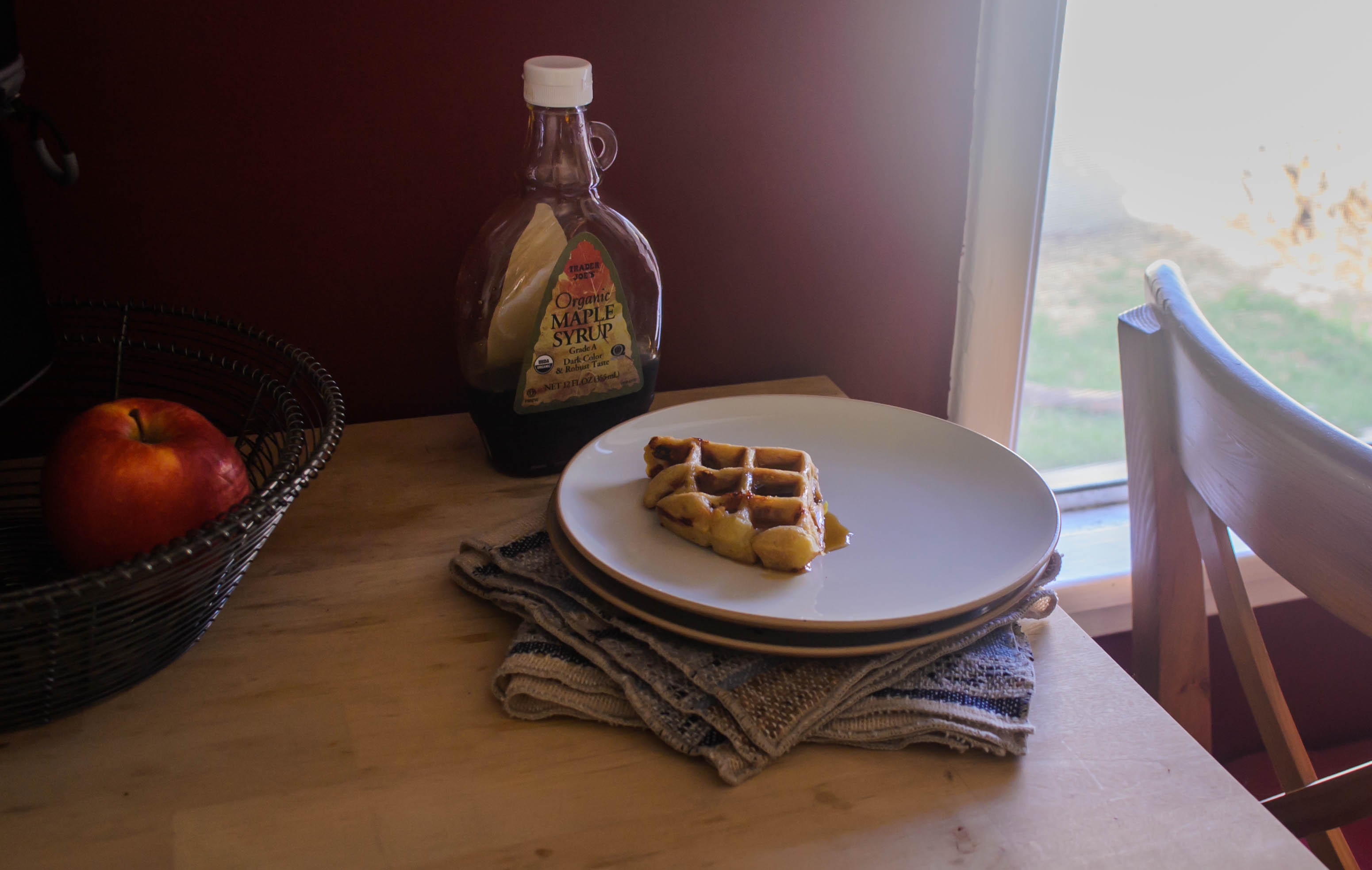 These start from my basic yeasted beer batter waffles recipe, which is adapted from King Arthur Flour. You can use milk instead of beer if you must, but between the yeast and the heat most of the alcohol is processed out, and the slightly bitter flavor of dark beer is such a welcome addition, balancing the rich cheese and tart apples. The first time I made these I was concerned about the apple pieces cooking all the way through in the short time they are enfolded in the waffle iron, but I needn’t have worried. They are in small enough pieces that they will cook. I like to leave the skins on for extra tartness, but you can peel them first if you prefer. Apples and cheese play well in both sweet and savory directions, so while I think a glug of maple syrup – we like to warm it up with a pinch of red pepper flakes for a little kick – makes these a complete meal, I could also see them providing a perfect raft for a moist thigh of roasted or fried chicken, or even piled with a fresh kale salad studded with walnuts and dried cherries.